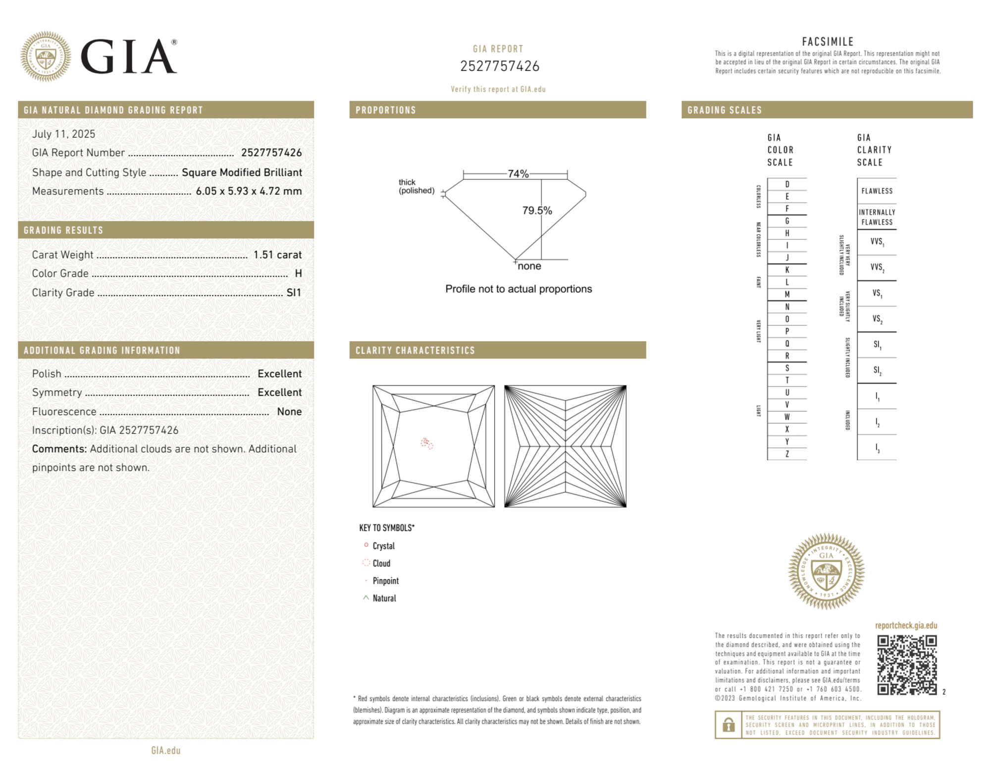 Your 1.51 carat Princess natural diamond is graded SI1 clarity, which stands for Slightly Included 1. Read more about SI1 clarity diamonds here, or learn more about diamond clarity in general here.