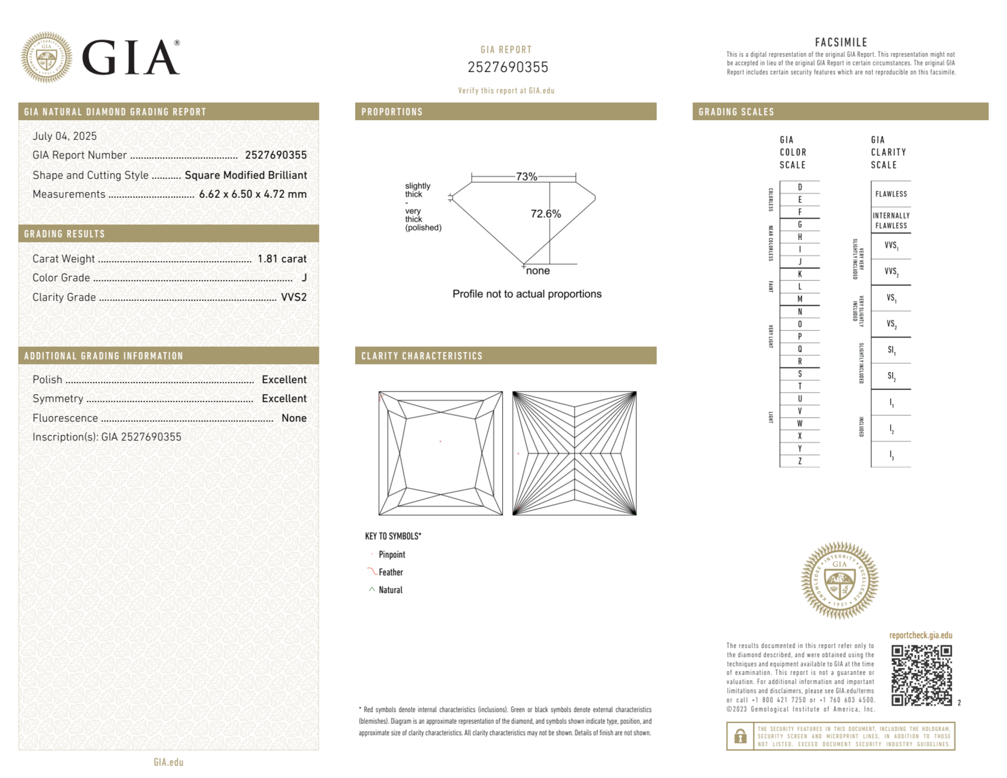 Your 1.81 carat Princess natural diamond is graded J color (Near Colorless), and you can read more about J color diamonds here.