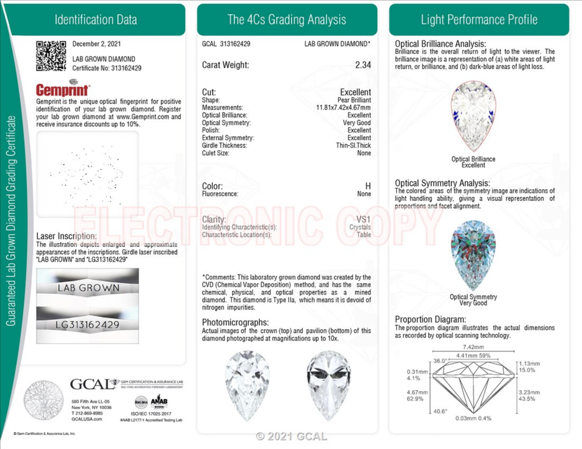 Your 2.34 carat Pear lab diamond is graded VS1 clarity, which stands for Very Slightly Included 1. Read more about VS1 clarity diamonds here, or learn more about diamond clarity in general here.