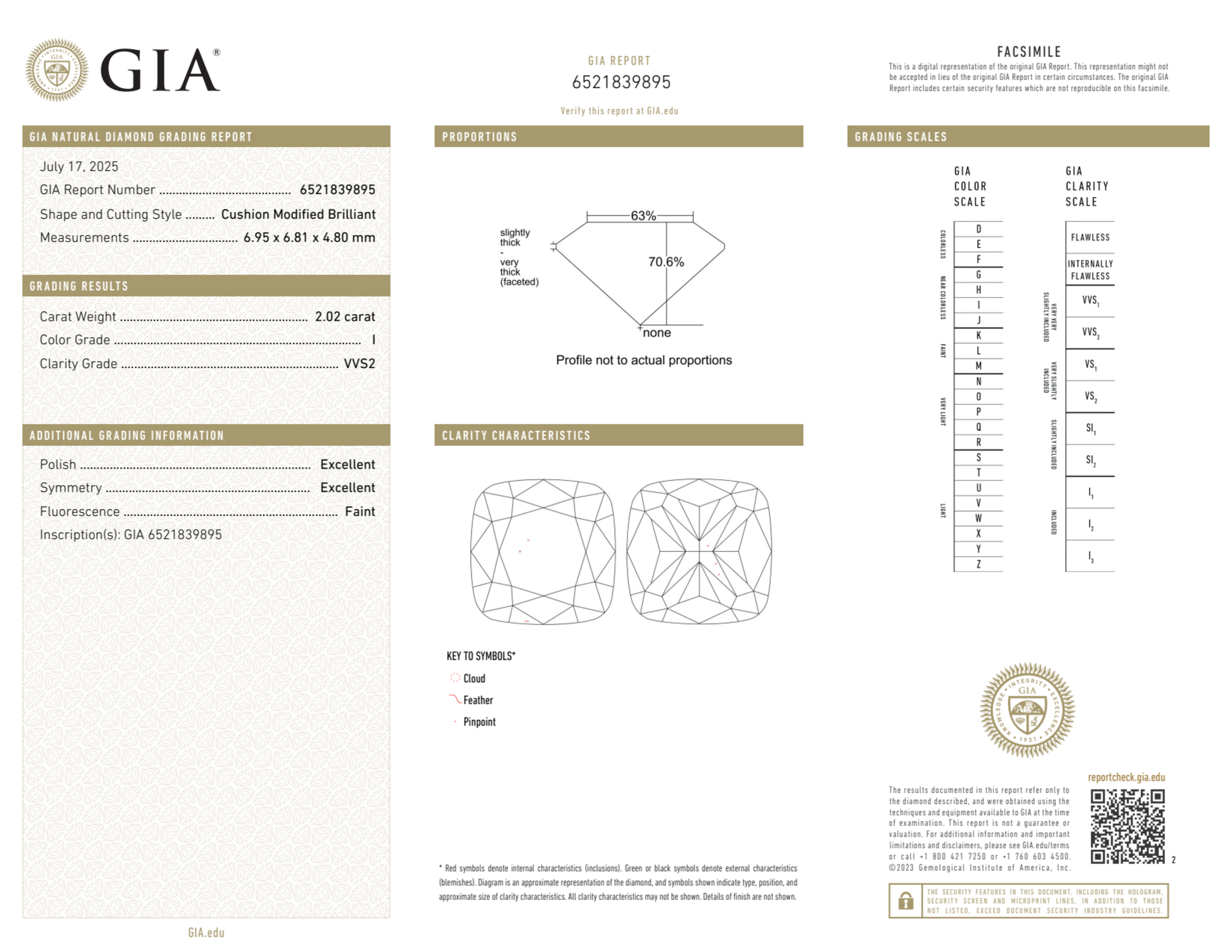 Your 2.02 carat Cushion natural diamond is graded VVS2 clarity, which stands for Very Very Slightly Included 2. Read more about VVS2 clarity diamonds here, or learn more about diamond clarity in general here.