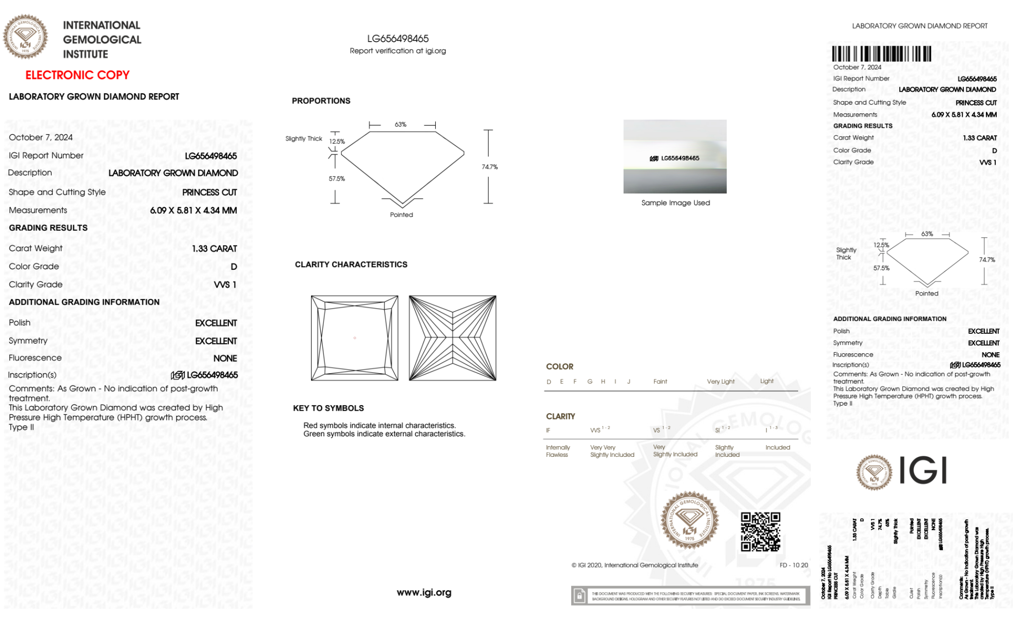 Your 1.33 carat Princess lab diamond is graded D color (Colorless), and you can read more about D color diamonds here.