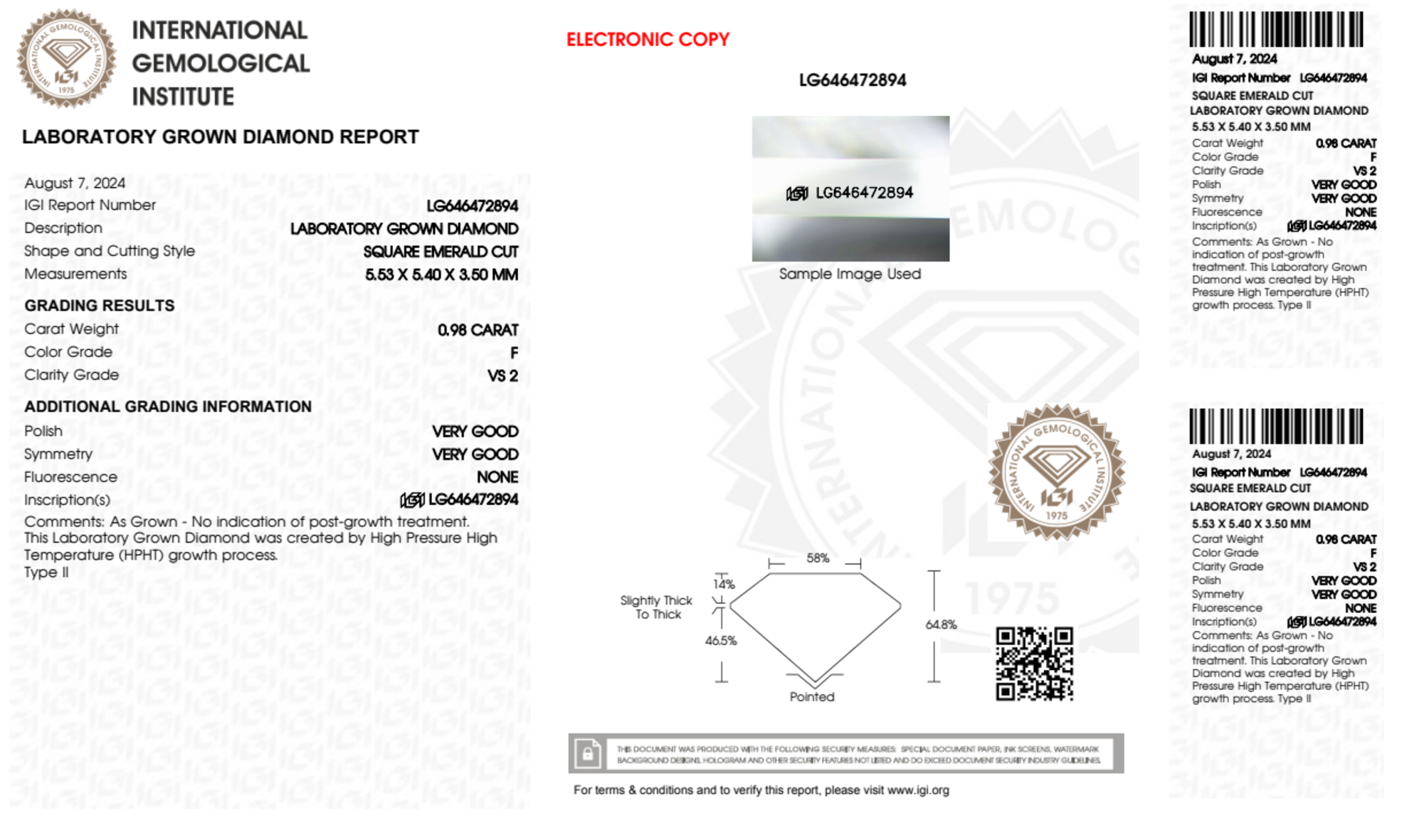 The price is truly amazing. High quality lab grown is a big advantage. The value is off the charts. Rare Carat has a terrific selection of ring designs and diamond inventory. We were able to replicate designs and features we saw in person at a local jewelry store and for a huge discount. The 30 day money back guarantee removed all of our concern. Shipping was fast and easy. The final result was exactly what we were looking for.