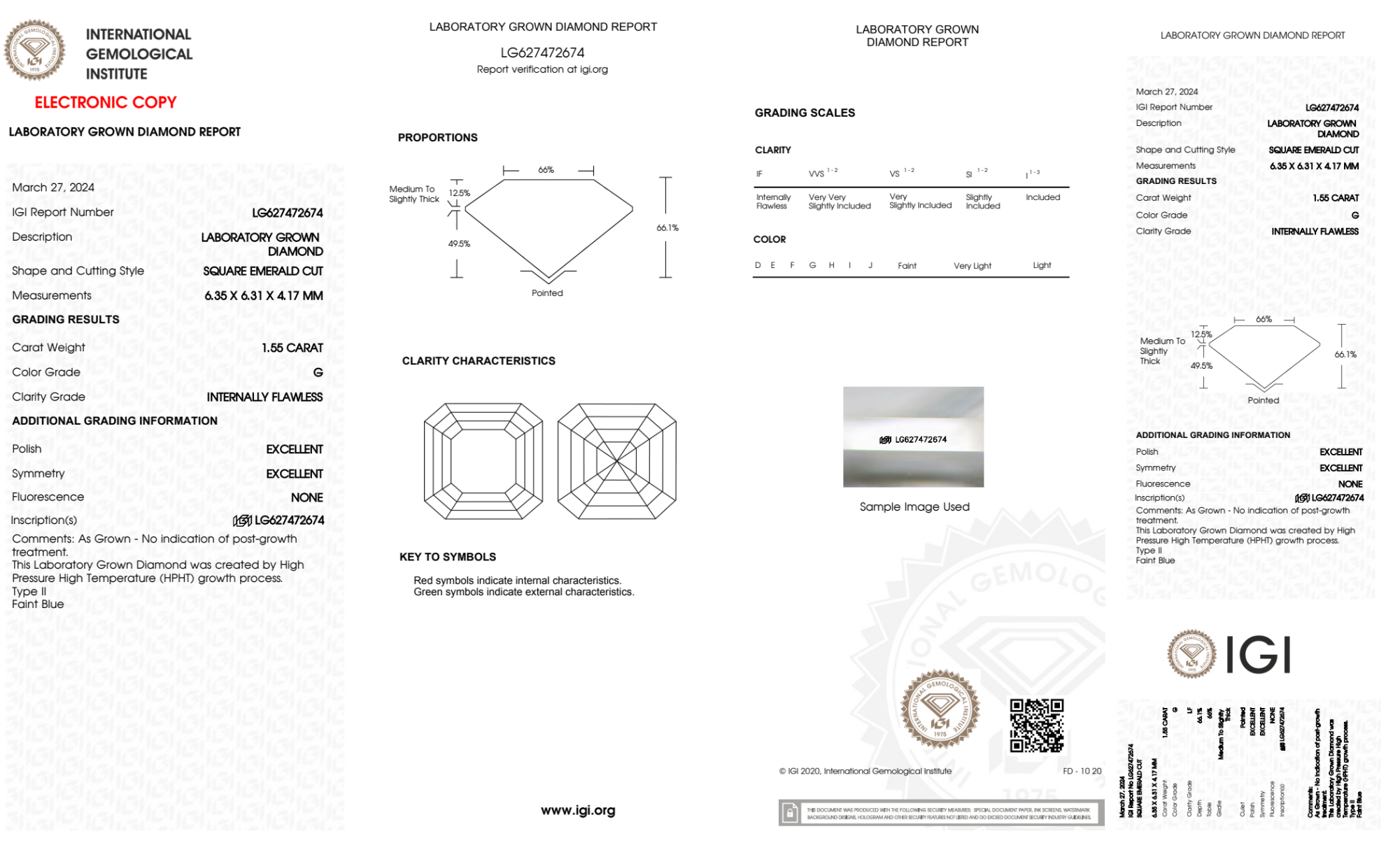 Your 1.55 carat Asscher lab diamond is graded IF clarity, which stands for Internally Flawless. Read more about IF clarity diamonds here, or learn more about diamond clarity in general here.
