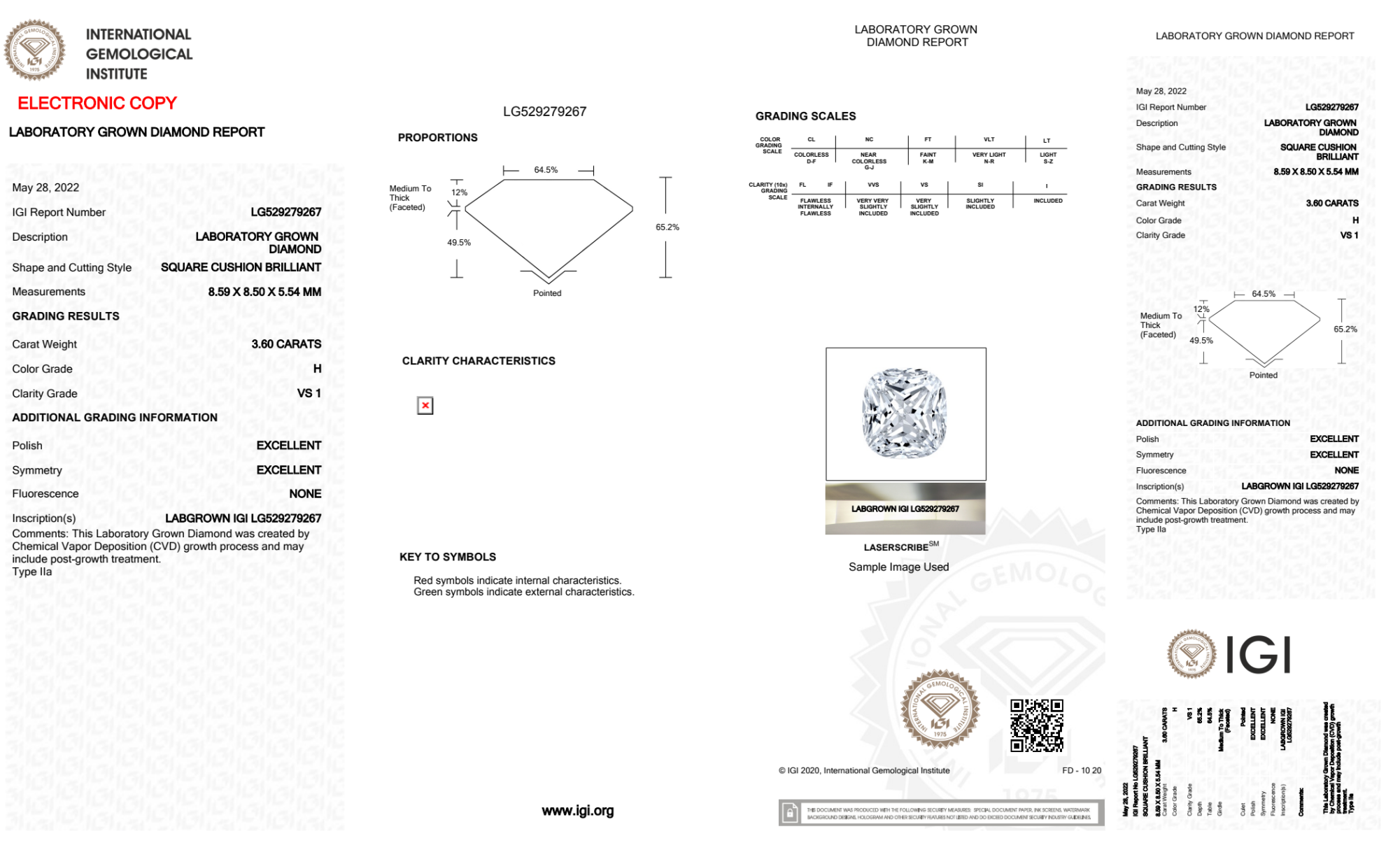 Your 3.60 carat Cushion lab diamond is graded H color (Near Colorless), and you can read more about H color diamonds here.
