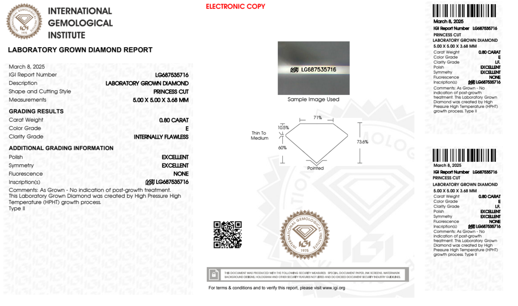 Your 0.80 carat Princess lab diamond is graded IF clarity, which stands for Internally Flawless. Read more about IF clarity diamonds here, or learn more about diamond clarity in general here.