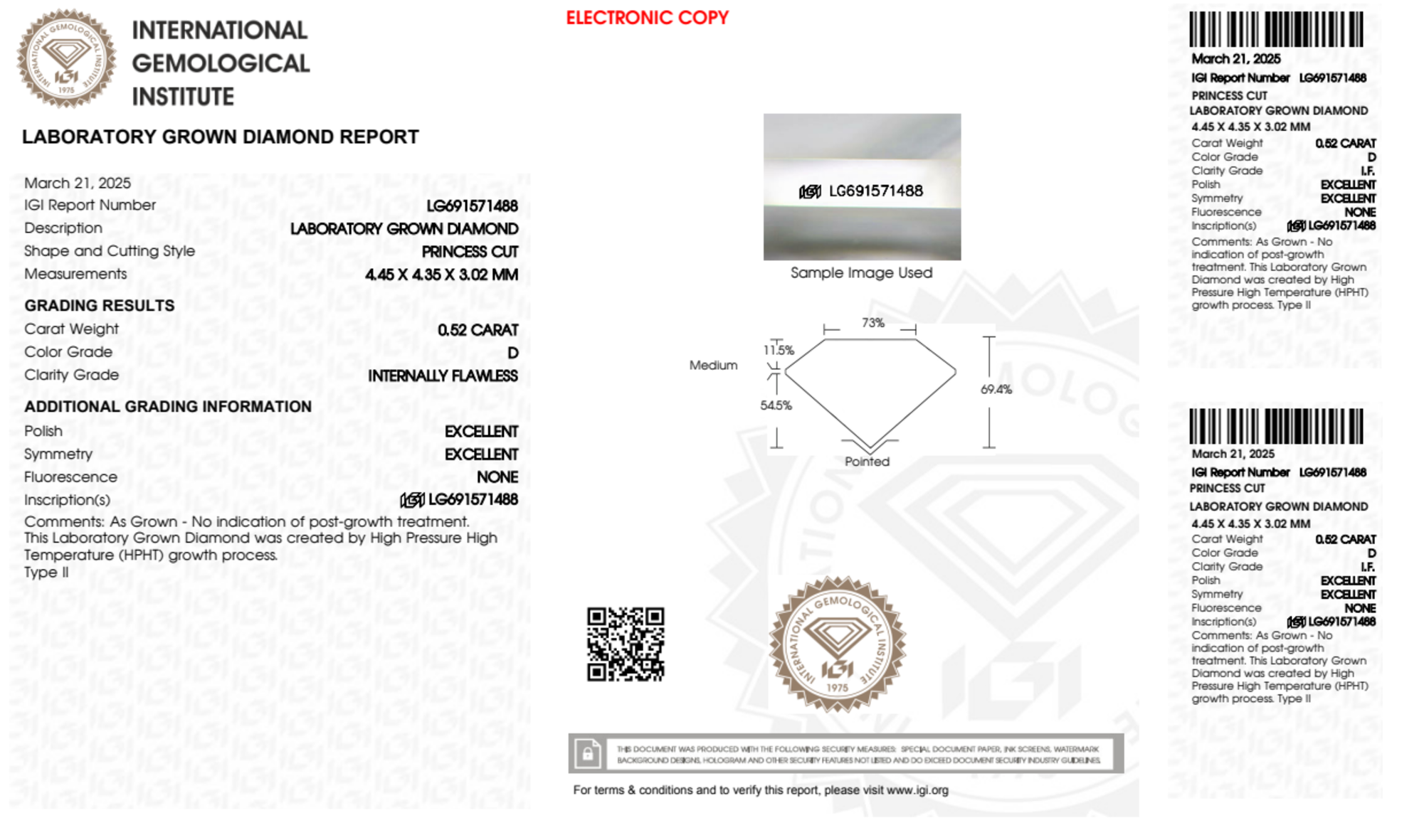 Your 0.52 carat Princess lab diamond is graded IF clarity, which stands for Internally Flawless. Read more about IF clarity diamonds here, or learn more about diamond clarity in general here.