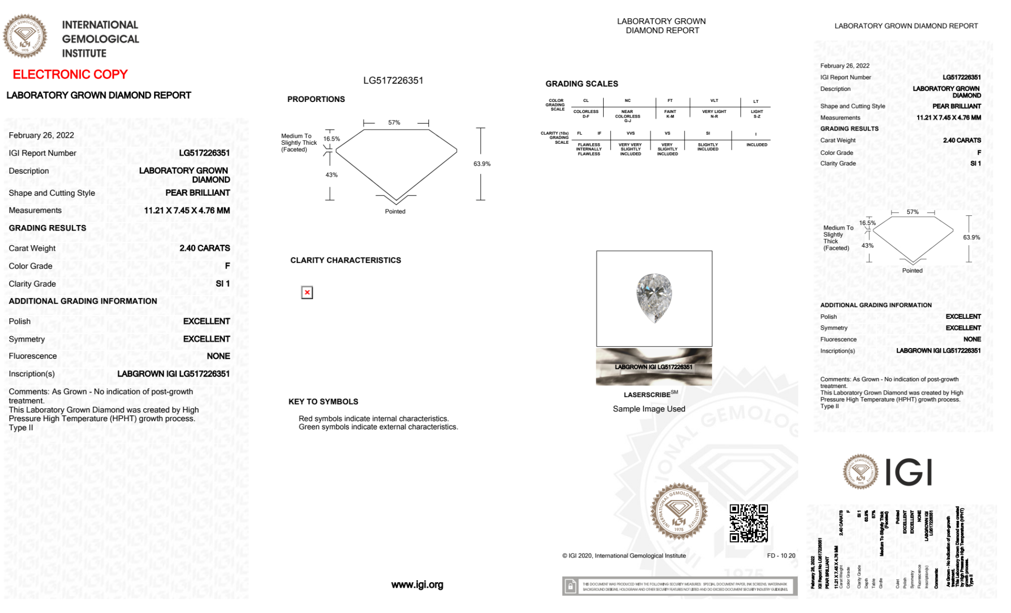 Your 2.40 carat Pear lab diamond is graded F color (Colorless), and you can read more about F color diamonds here.