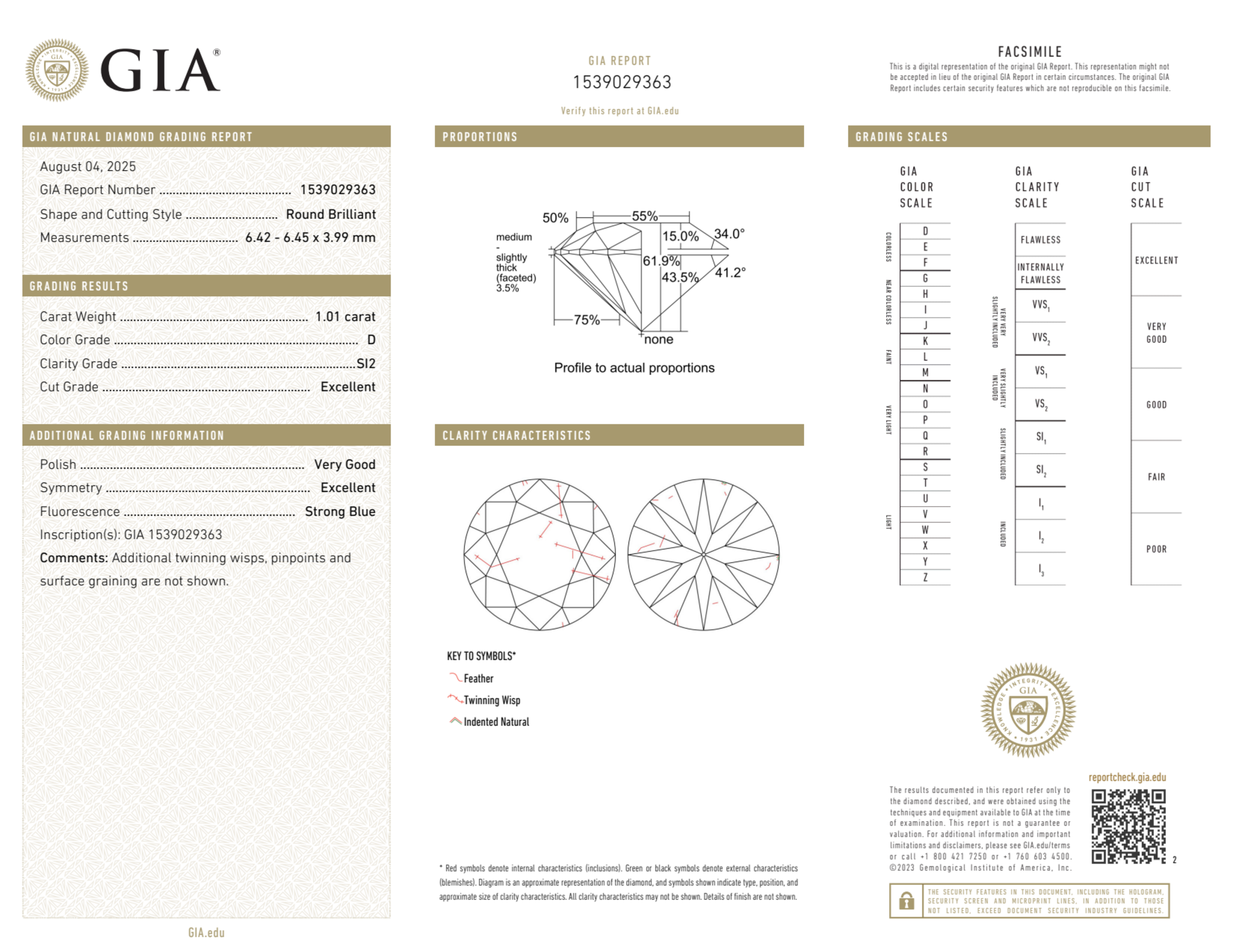 Your 1.01 carat Round natural diamond is graded SI2 clarity, which stands for Slightly Included 2. Read more about SI2 clarity diamonds here, or learn more about diamond clarity in general here.
