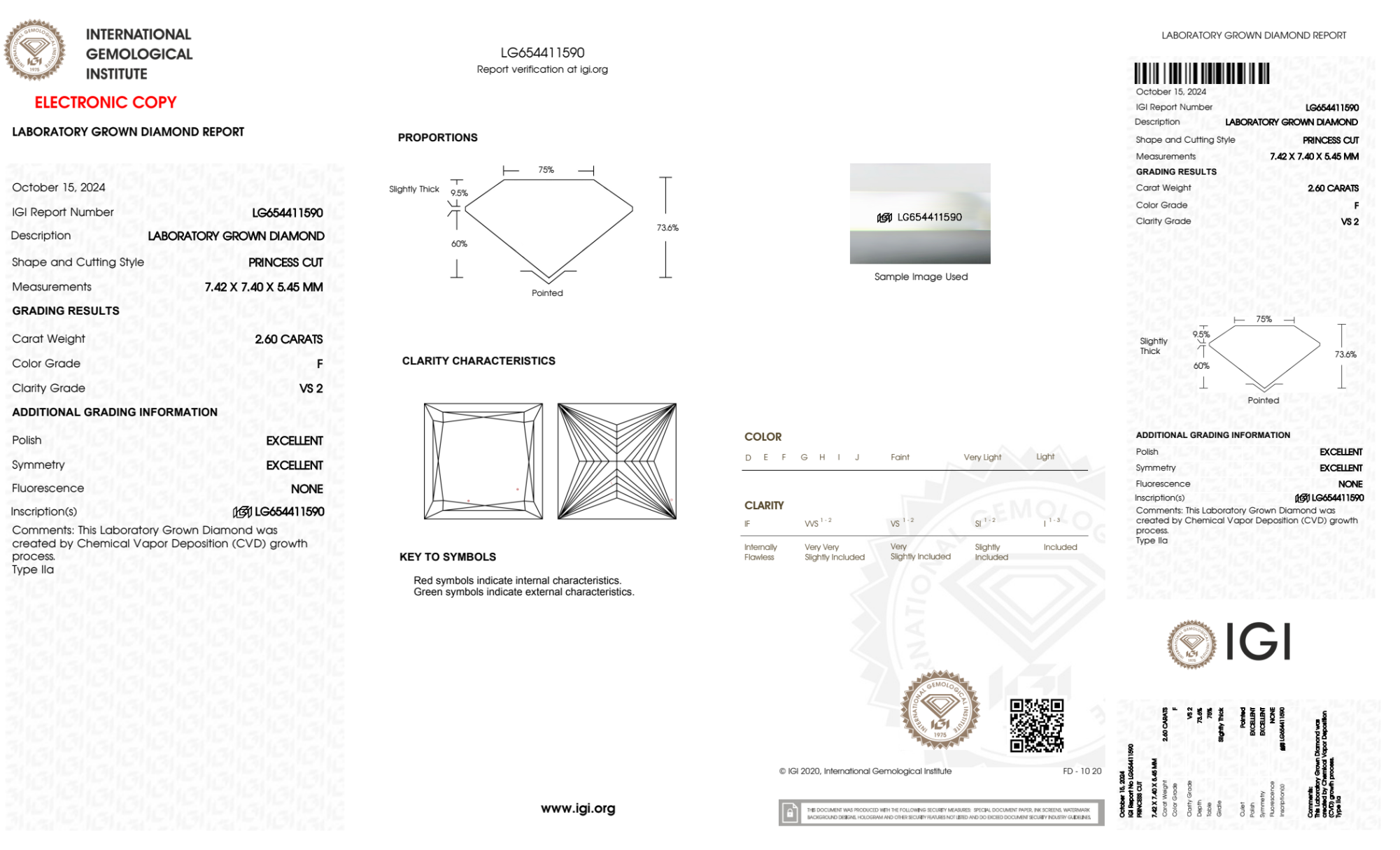 Your 2.60 carat Princess lab diamond is graded F color (Colorless), and you can read more about F color diamonds here.