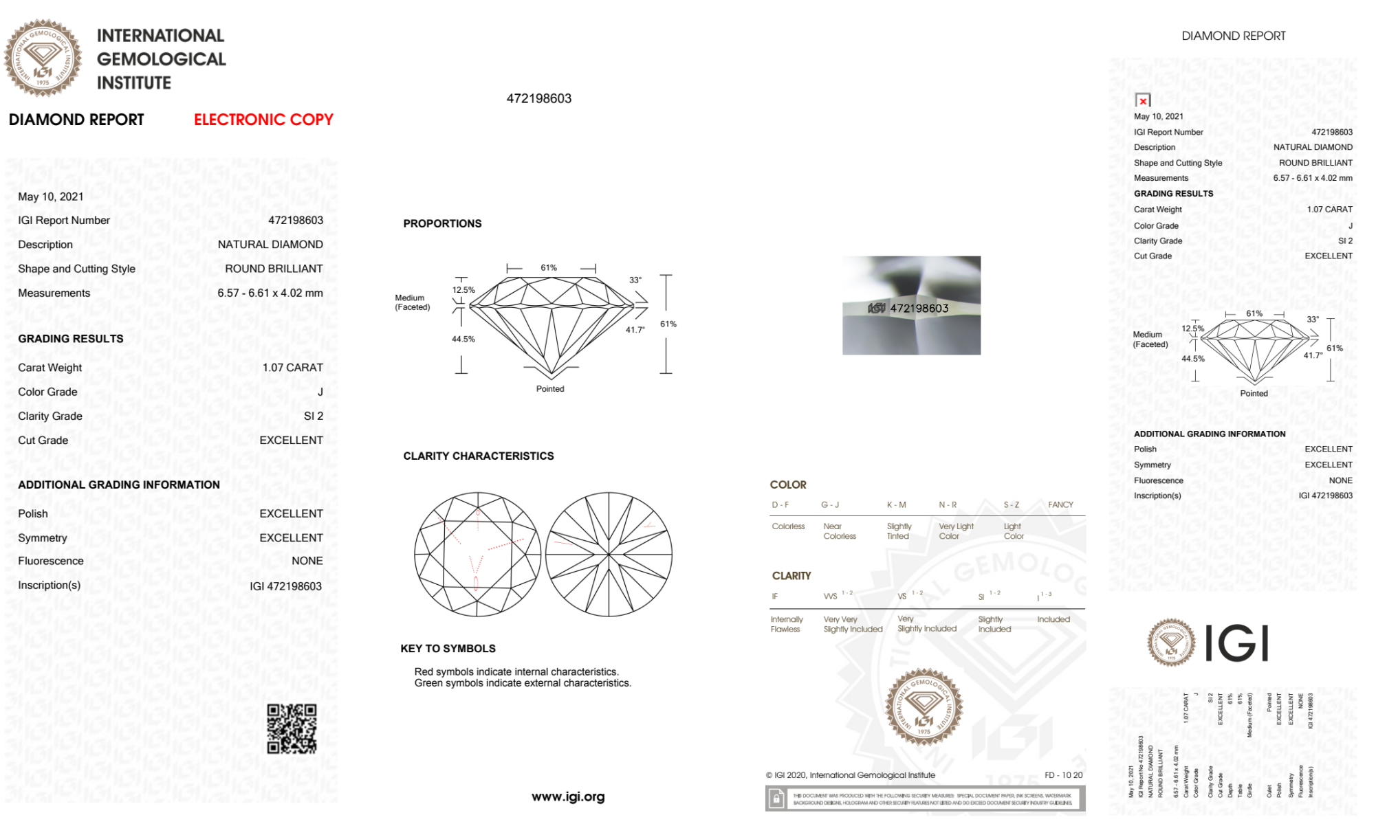 Your 1.07 carat Round natural diamond is graded J color (Near Colorless), and you can read more about J color diamonds here.