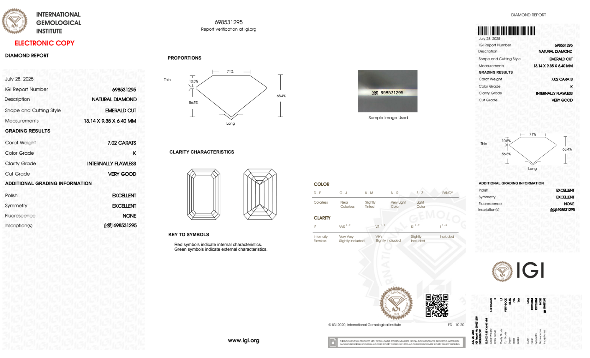Your 7.02 carat Emerald natural diamond is graded IF clarity, which stands for Internally Flawless. Read more about IF clarity diamonds here, or learn more about diamond clarity in general here.