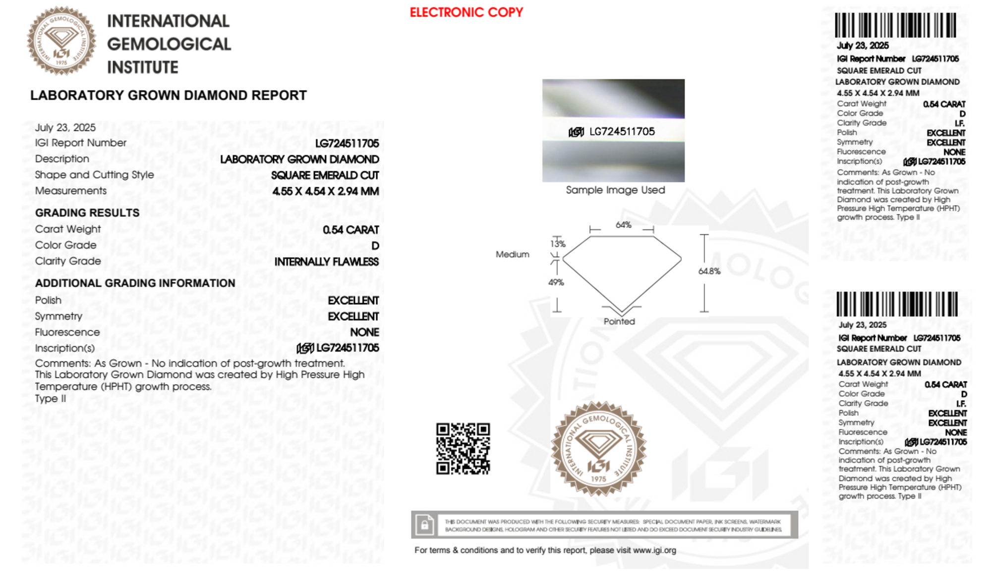 Your 0.54 carat Asscher lab diamond is graded IF clarity, which stands for Internally Flawless. Read more about IF clarity diamonds here, or learn more about diamond clarity in general here.