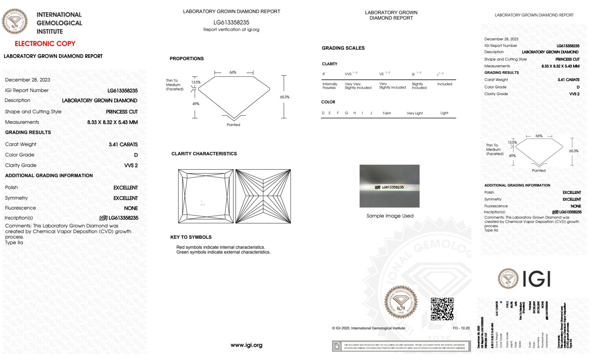 Your 3.41 carat Princess lab diamond is graded D color (Colorless), and you can read more about D color diamonds here.