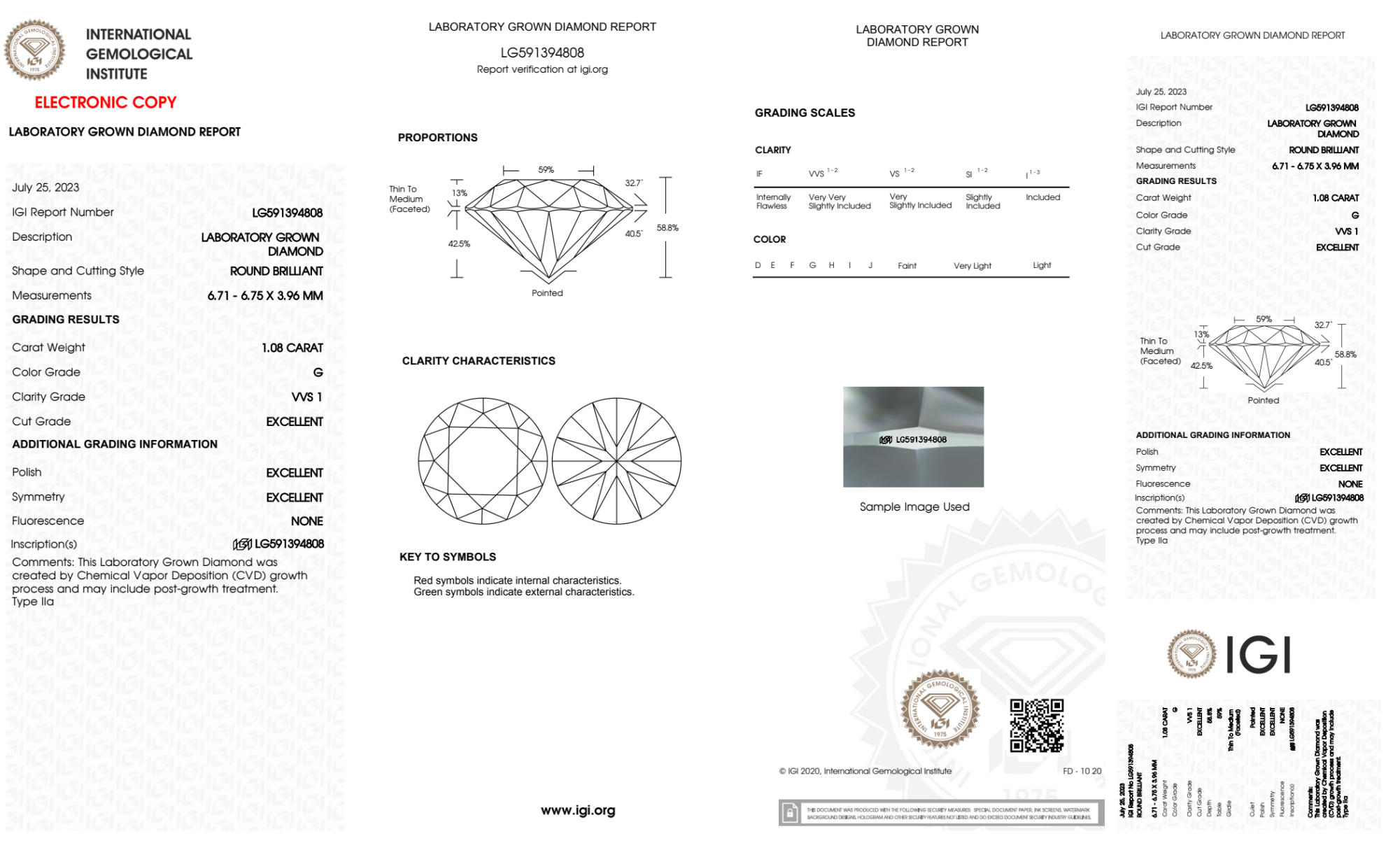 Your 1.08 carat Round lab diamond is graded G color (Near Colorless), and you can read more about G color diamonds here.
