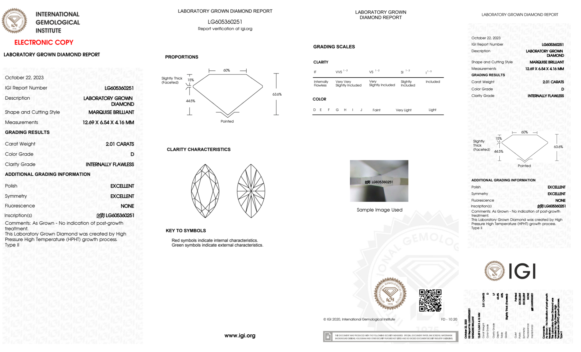 Your 2.01 carat Marquise lab diamond is graded D color (Colorless), and you can read more about D color diamonds here.