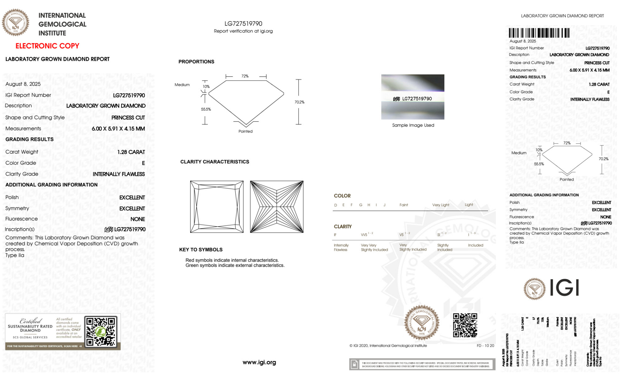 Your 1.28 carat Princess lab diamond is graded E color (Colorless), and you can read more about E color diamonds here.