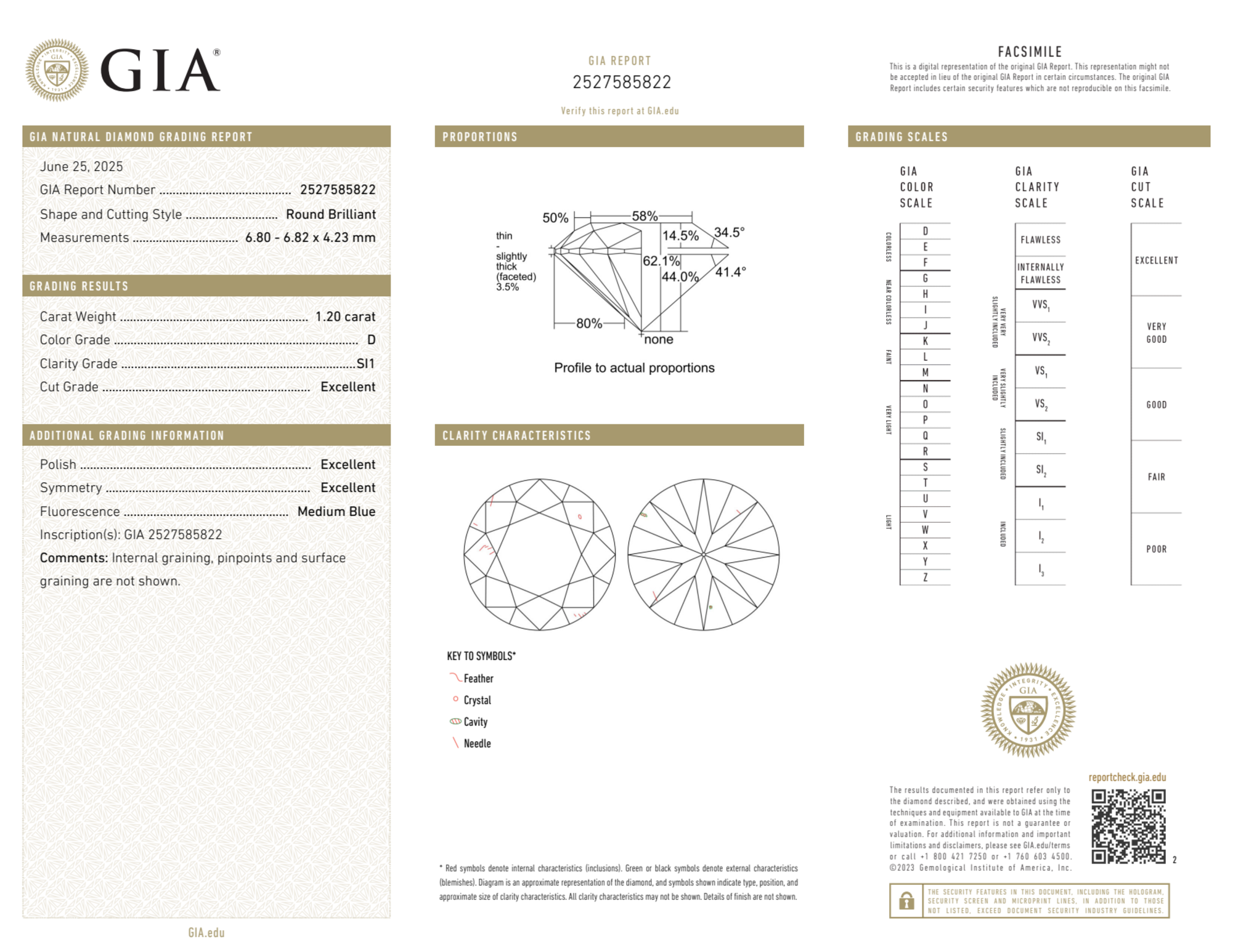Your 1.20 carat Round natural diamond is graded D color (Colorless), and you can read more about D color diamonds here.