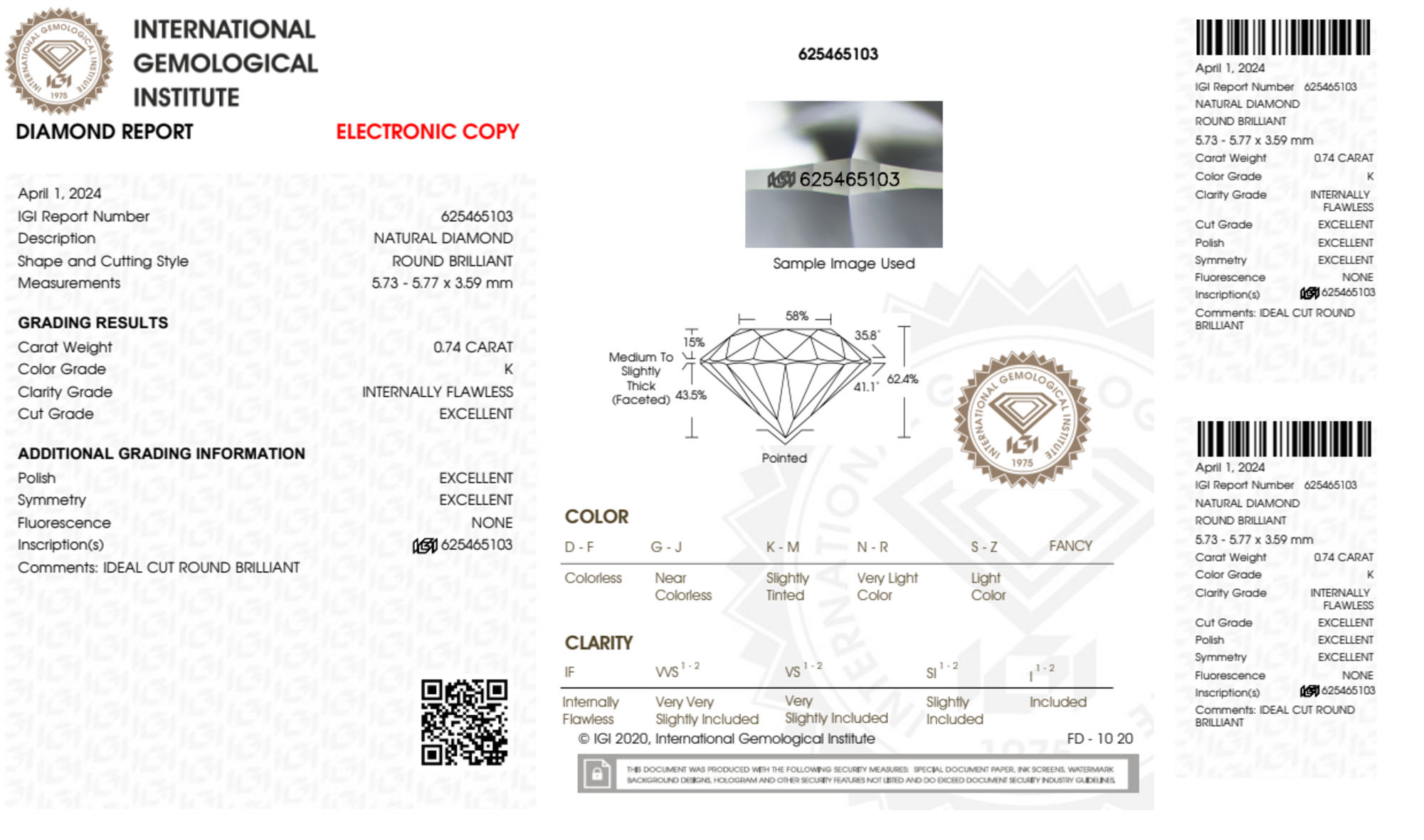 Your 0.74 carat Round natural diamond is graded IF clarity, which stands for Internally Flawless. Read more about IF clarity diamonds here, or learn more about diamond clarity in general here.