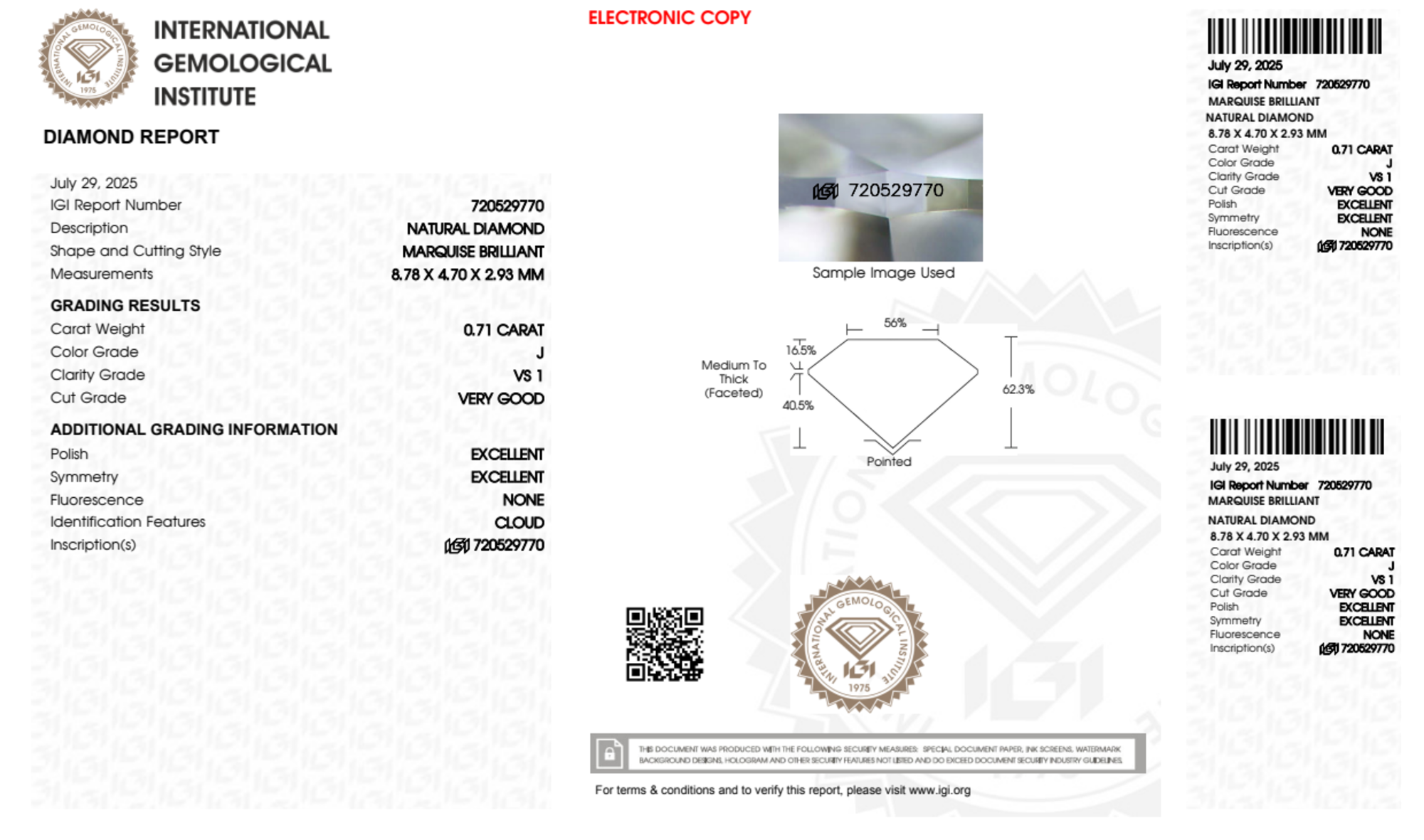 Your 0.71 carat Marquise natural diamond is graded J color (Near Colorless), and you can read more about J color diamonds here.
