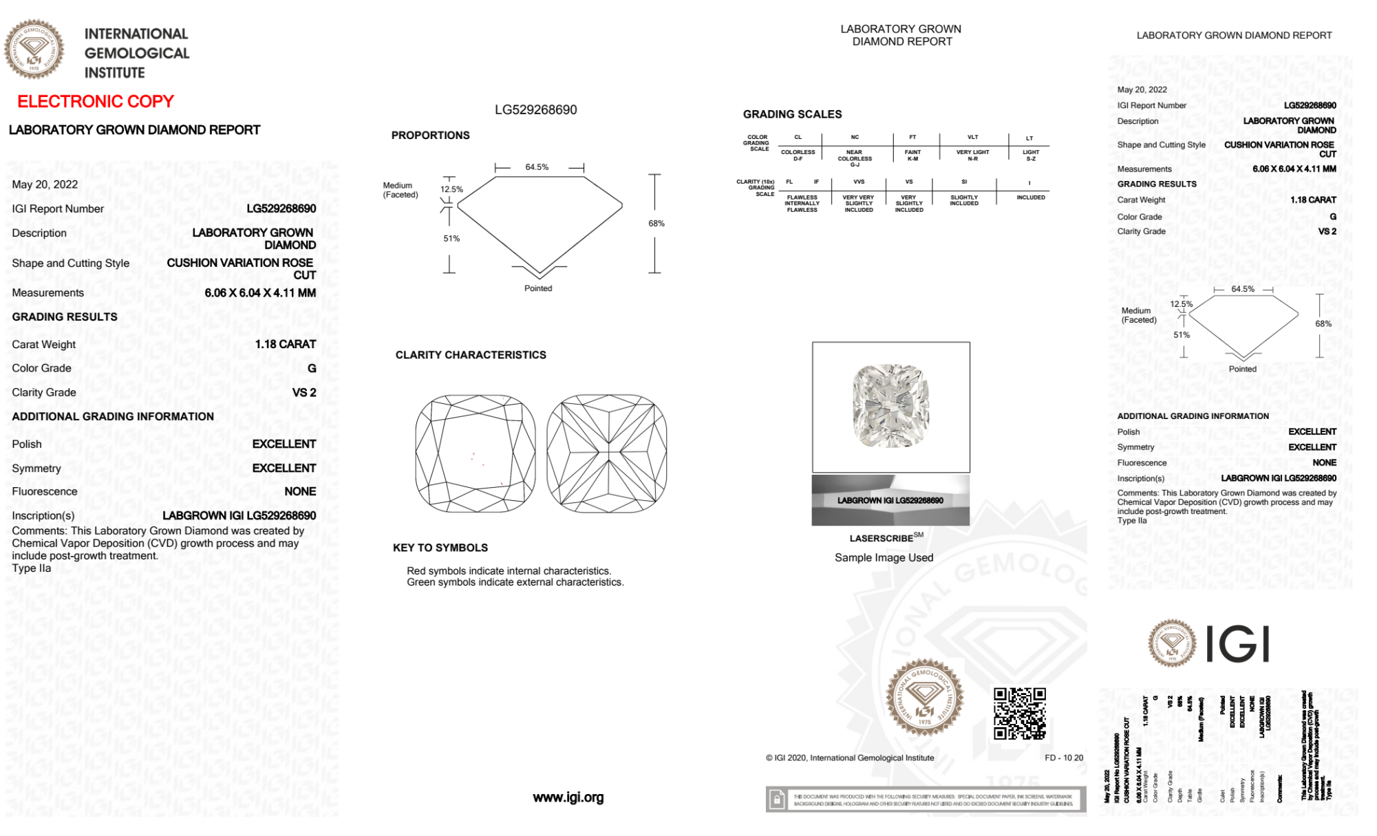 Your 1.18 carat Cushion lab diamond is graded G color (Near Colorless), and you can read more about G color diamonds here.
