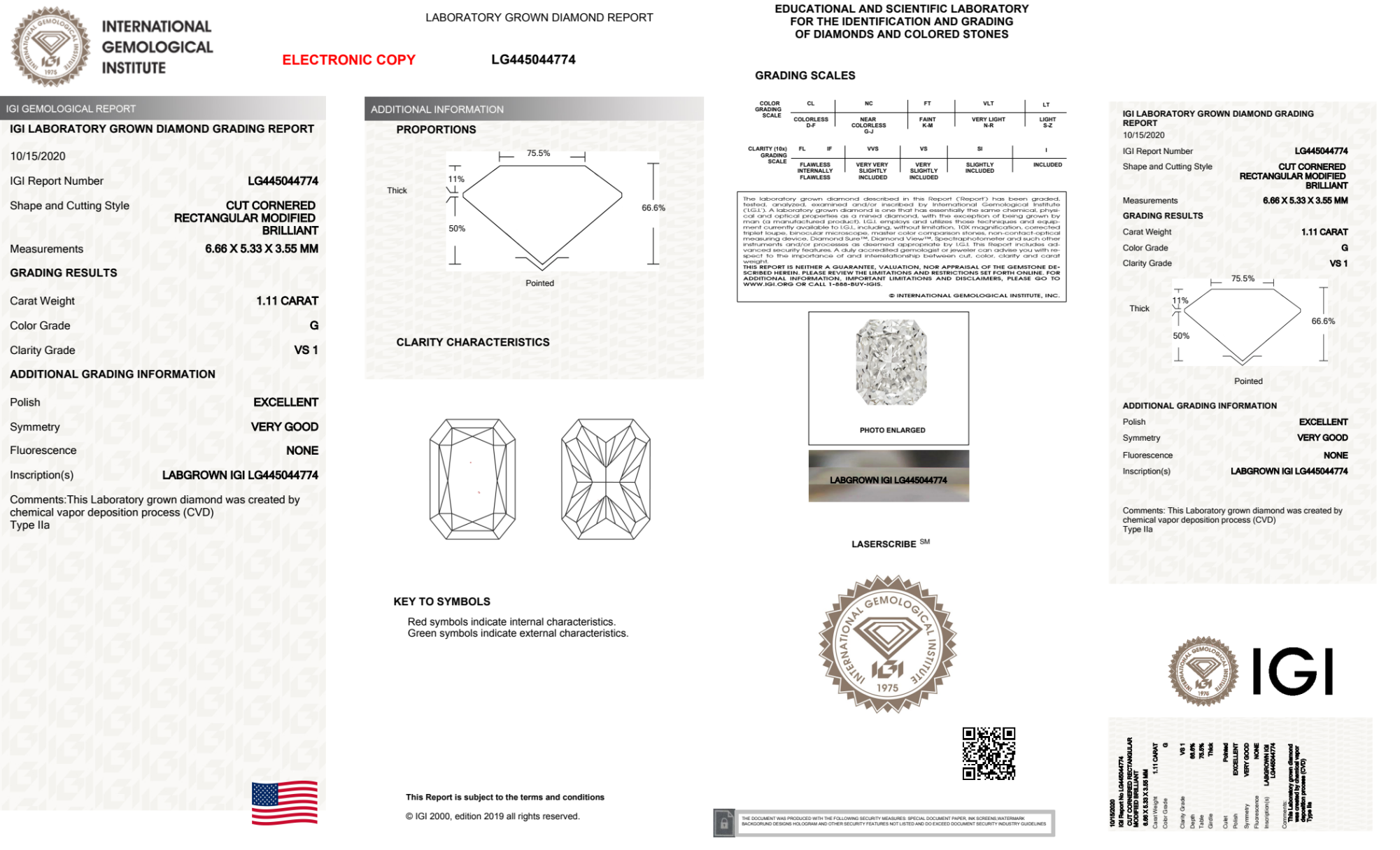 Your 1.11 carat Radiant lab diamond is graded G color (Near Colorless), and you can read more about G color diamonds here.
