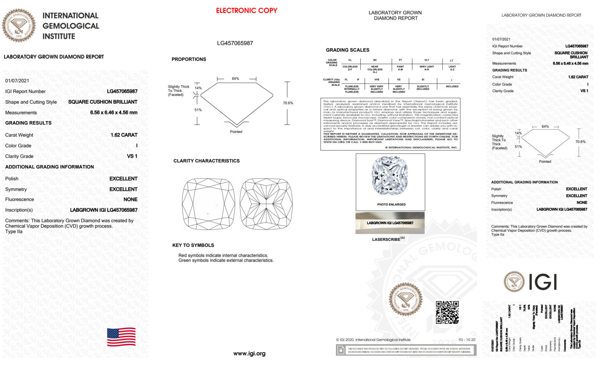 Your 1.62 carat Cushion lab diamond is graded VS1 clarity, which stands for Very Slightly Included 1. Read more about VS1 clarity diamonds here, or learn more about diamond clarity in general here.