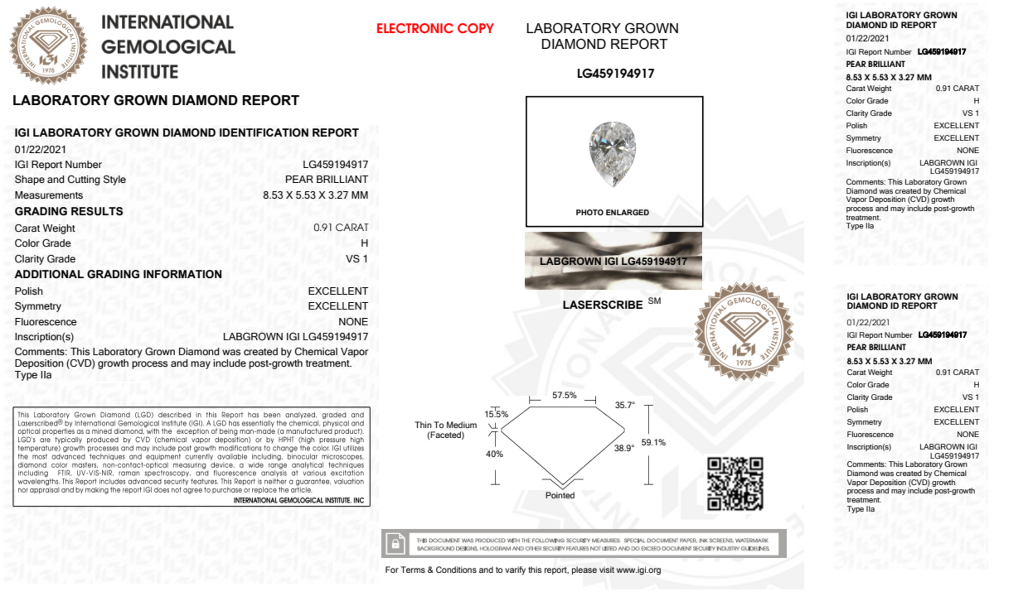 Your 0.91 carat Pear lab diamond is graded H color (Near Colorless), and you can read more about H color diamonds here.