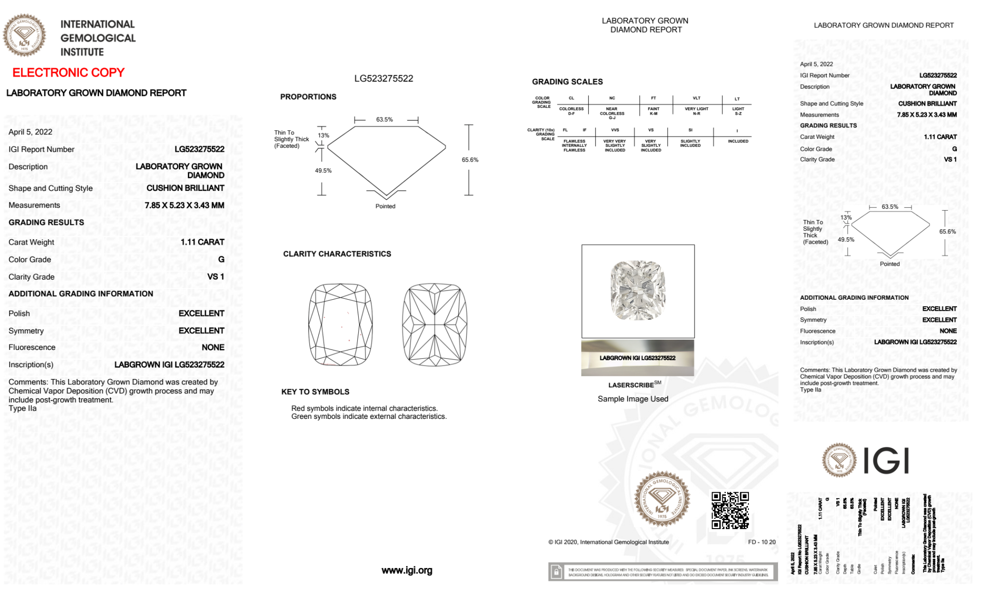 Your 1.11 carat Cushion lab diamond is graded G color (Near Colorless), and you can read more about G color diamonds here.