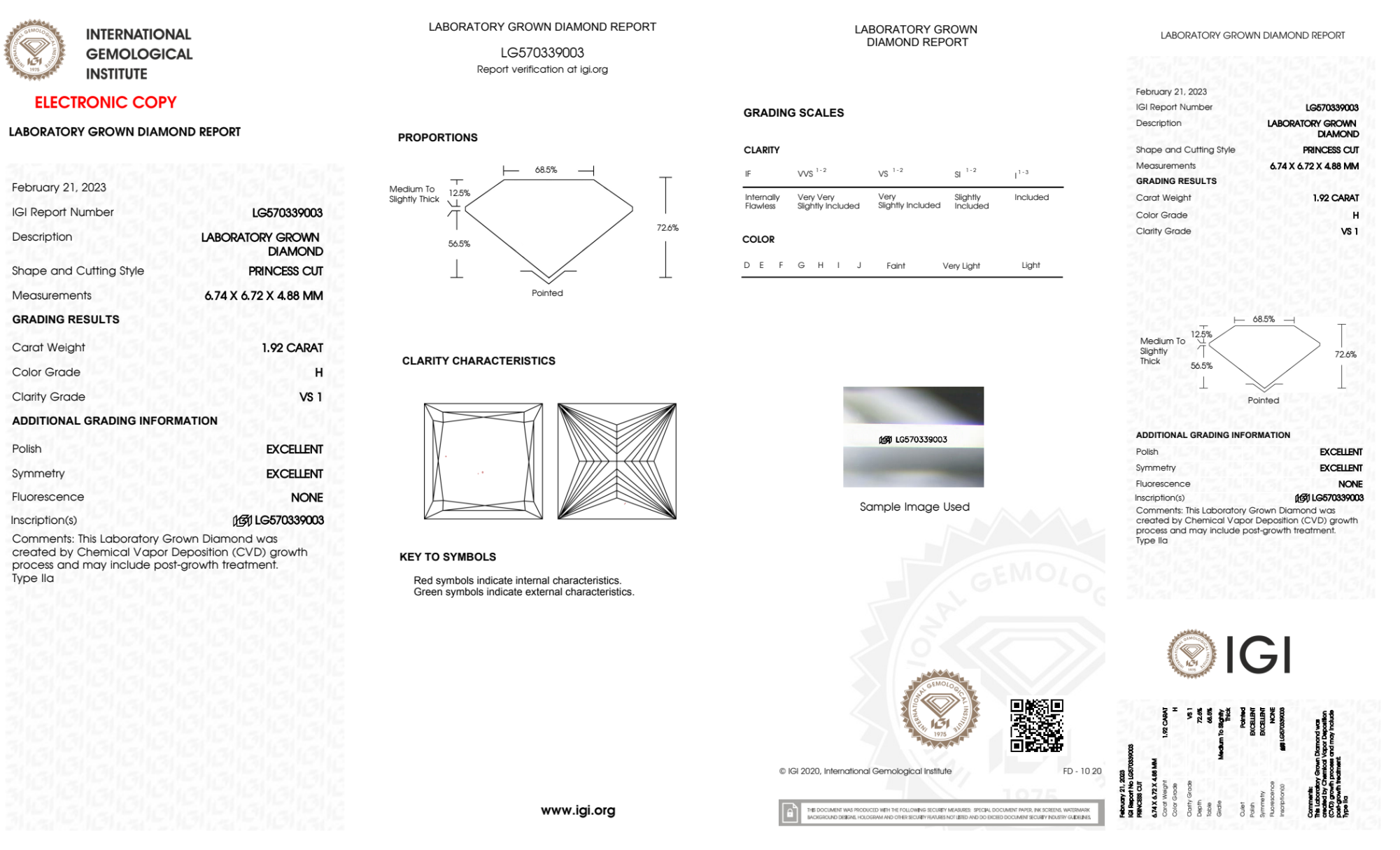 Your 1.92 carat Princess lab diamond is graded H color (Near Colorless), and you can read more about H color diamonds here.