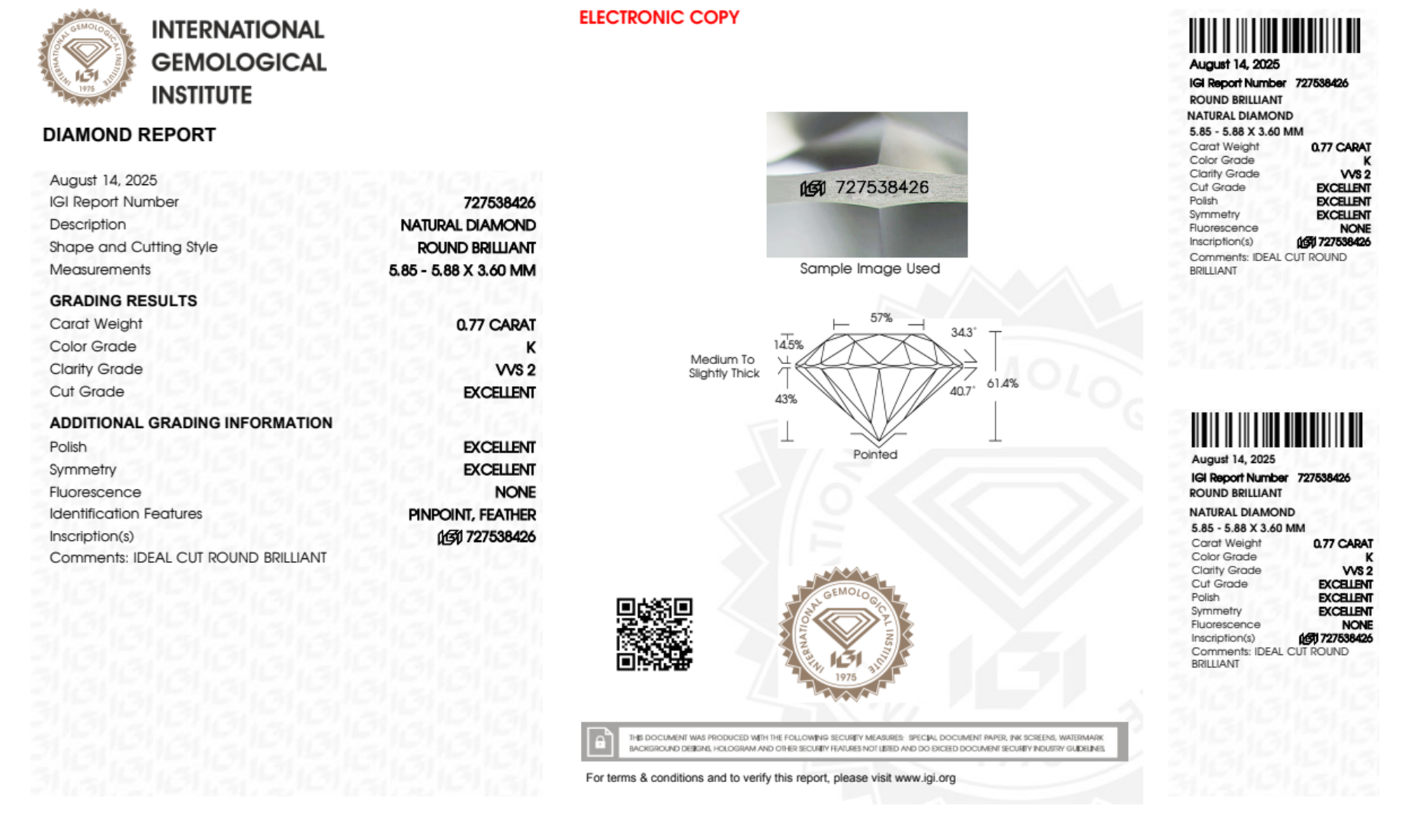 Your 0.77 carat Round natural diamond is graded VVS2 clarity, which stands for Very Very Slightly Included 2. Read more about VVS2 clarity diamonds here, or learn more about diamond clarity in general here.
