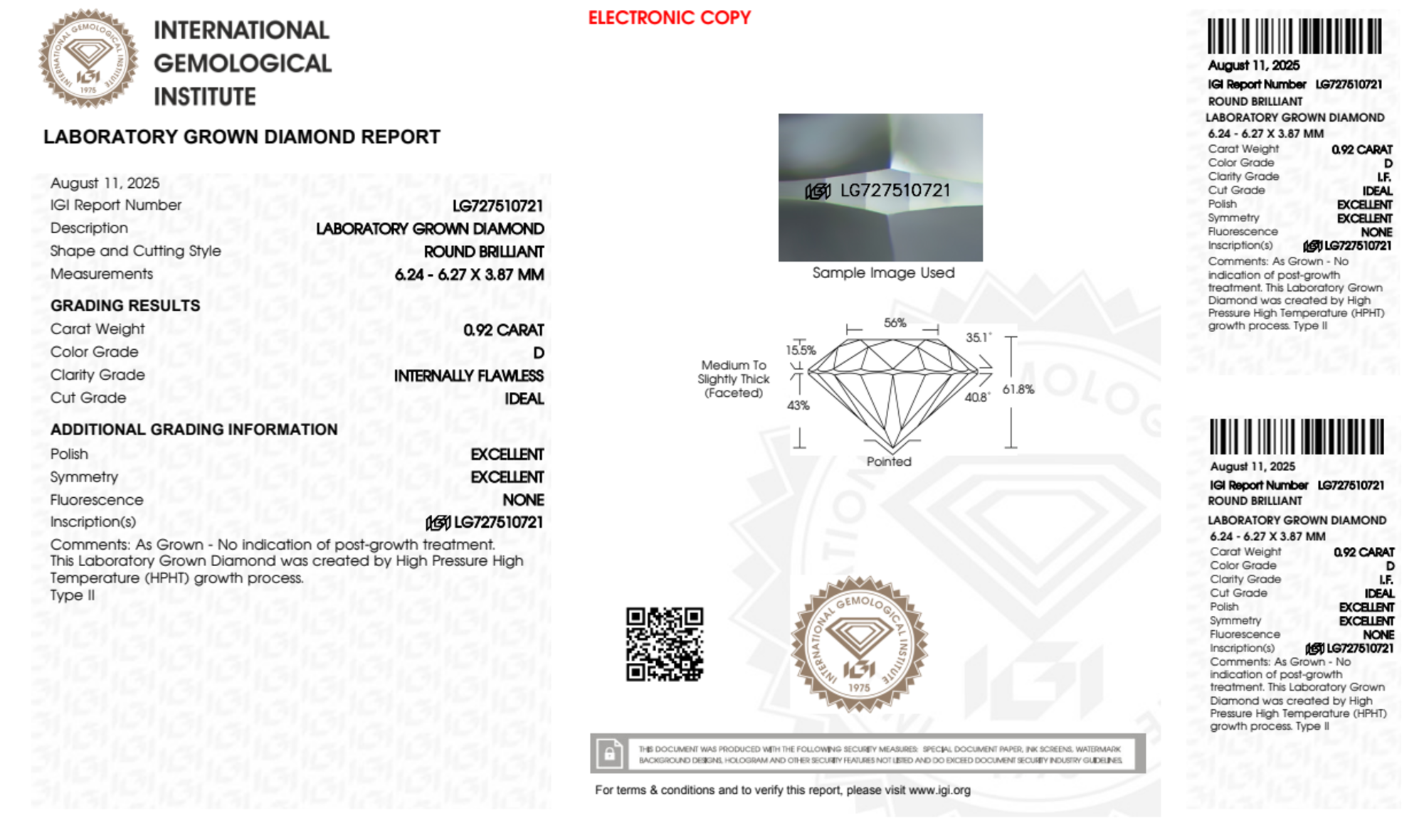 Your 0.92 carat Round lab diamond is graded IF clarity, which stands for Internally Flawless. Read more about IF clarity diamonds here, or learn more about diamond clarity in general here.