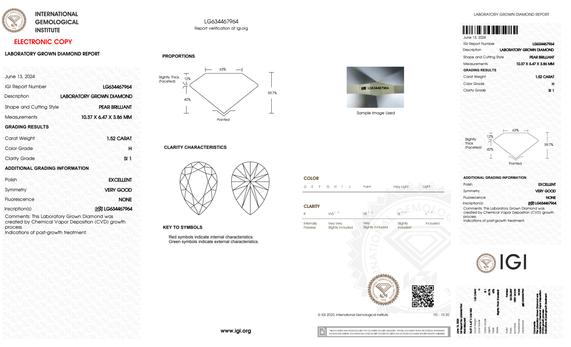 Your 1.52 carat Pear lab diamond is graded SI1 clarity, which stands for Slightly Included 1. Read more about SI1 clarity diamonds here, or learn more about diamond clarity in general here.