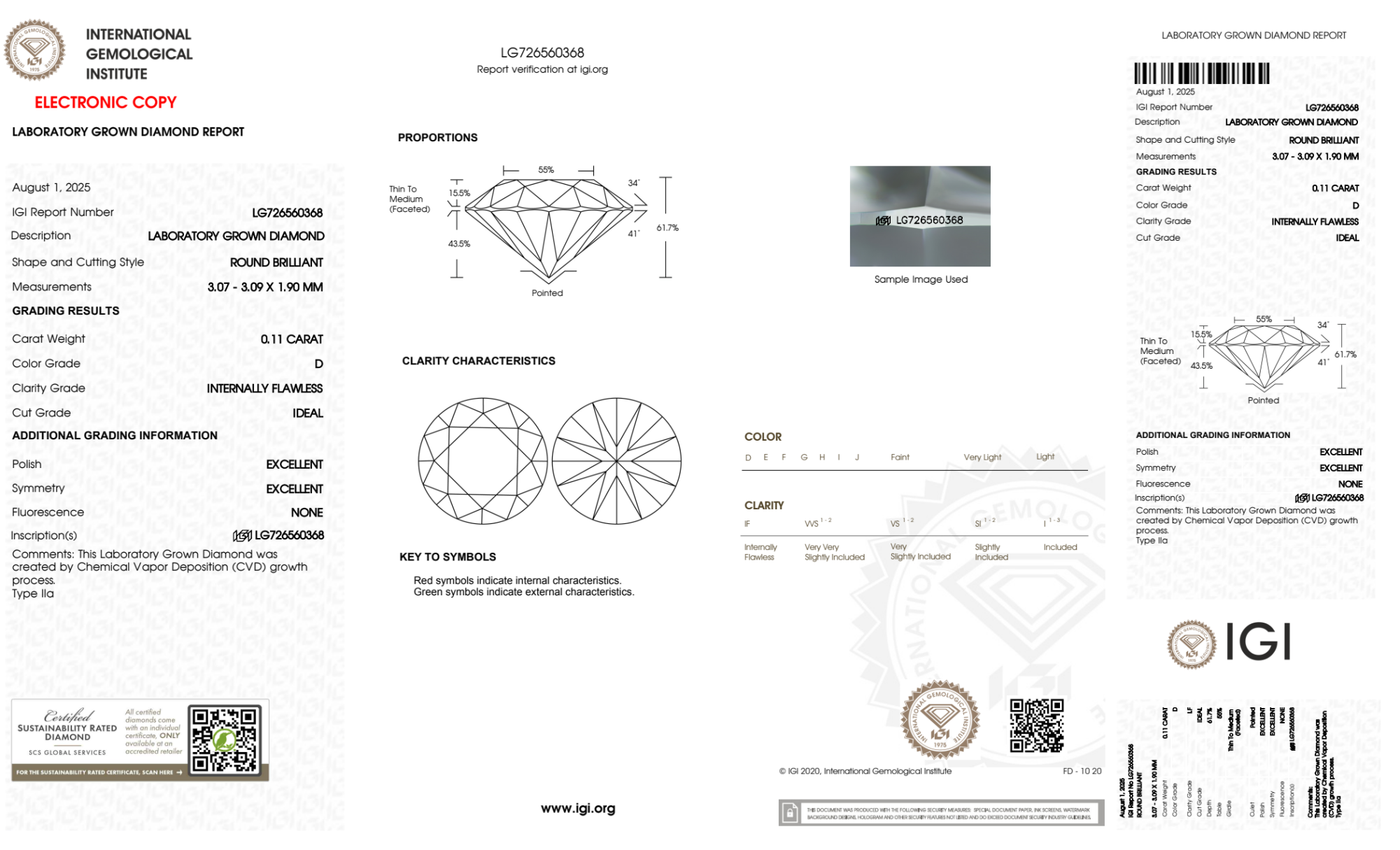 Your 0.11 carat Round lab diamond is graded IF clarity, which stands for Internally Flawless. Read more about IF clarity diamonds here, or learn more about diamond clarity in general here.