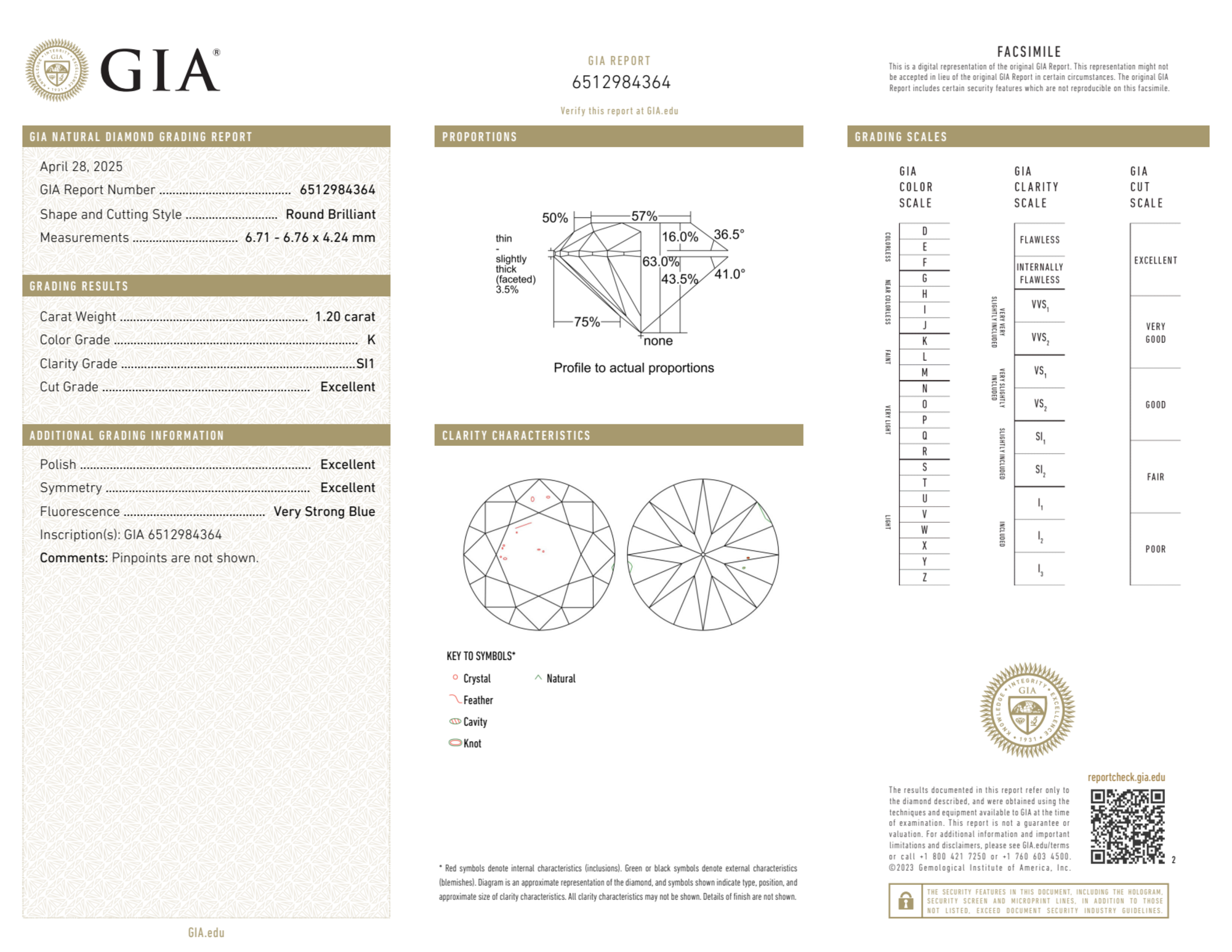 Your 1.20 carat Round natural diamond is graded K color (Faint Color), and you can read more about K color diamonds here.
