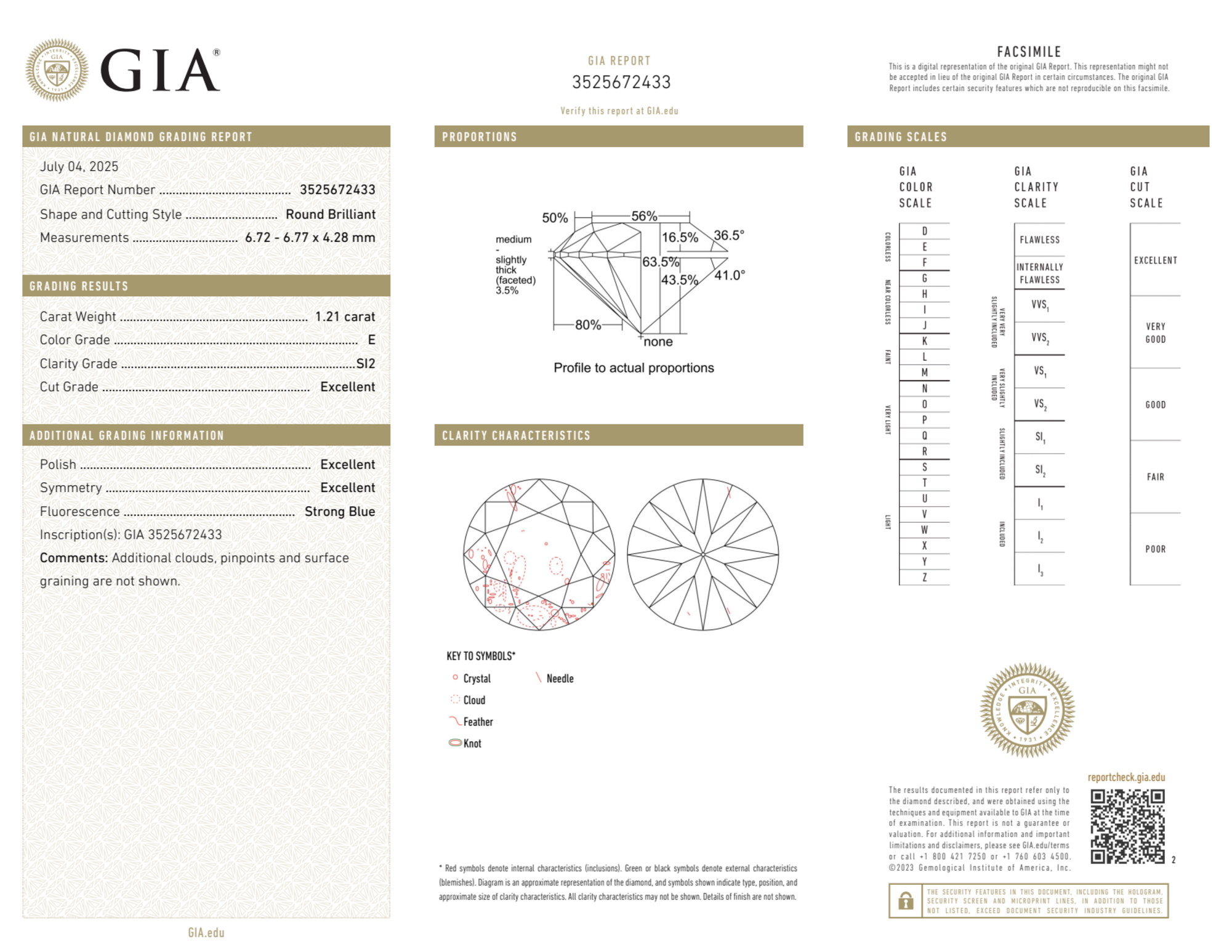 Your 1.21 carat Round natural diamond is graded E color (Colorless), and you can read more about E color diamonds here.