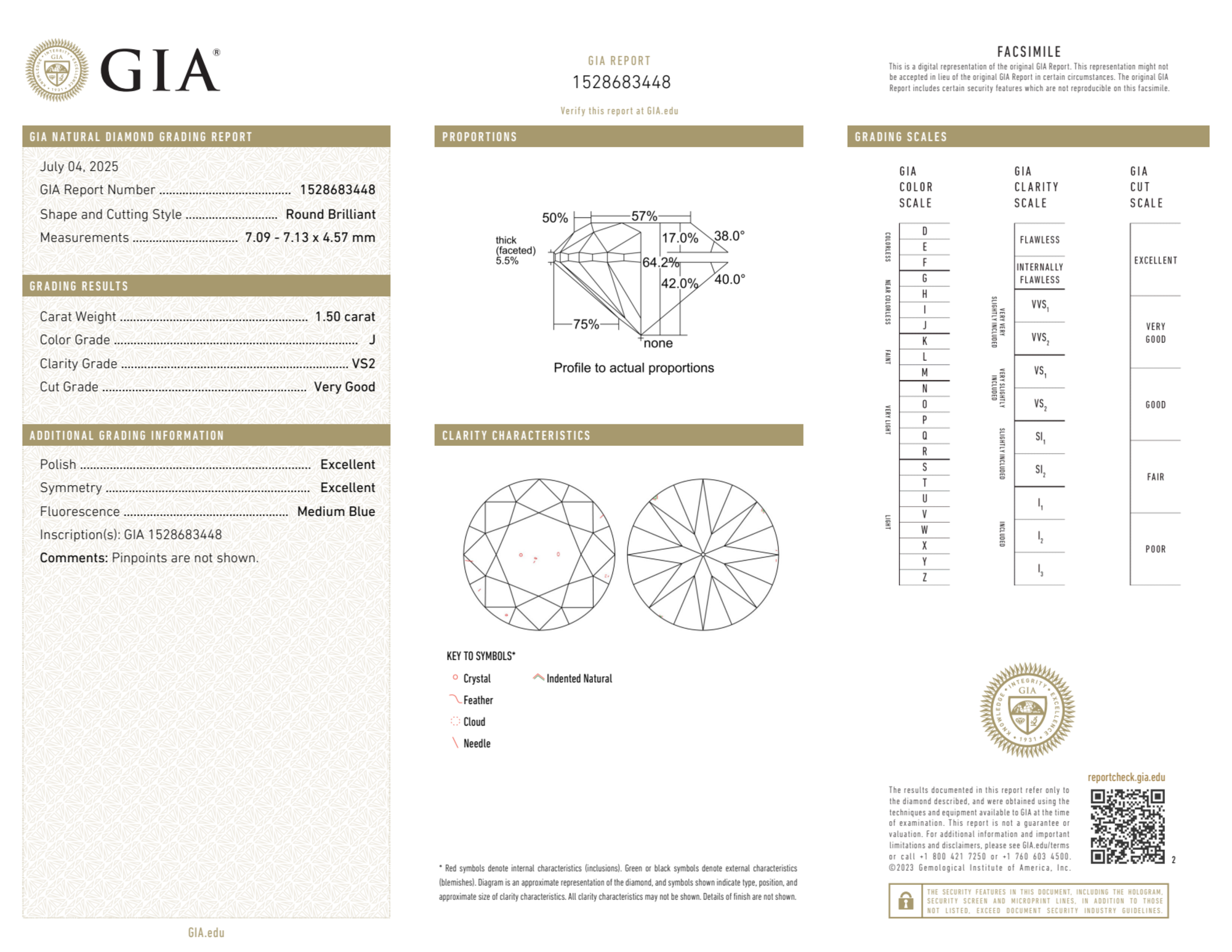 Your 1.50 carat Round natural diamond is graded J color (Near Colorless), and you can read more about J color diamonds here.