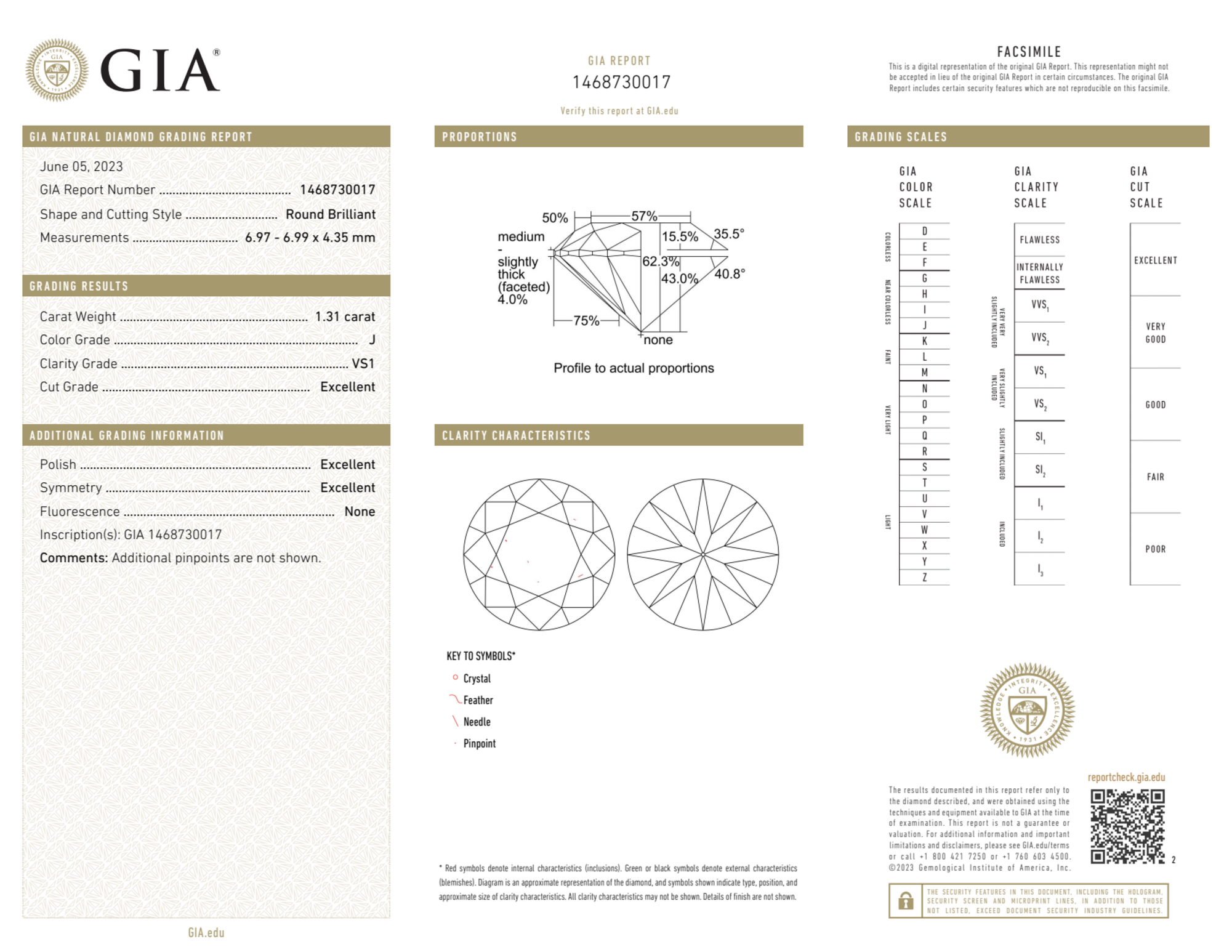 Your 1.31 carat Round natural diamond is graded J color (Near Colorless), and you can read more about J color diamonds here.