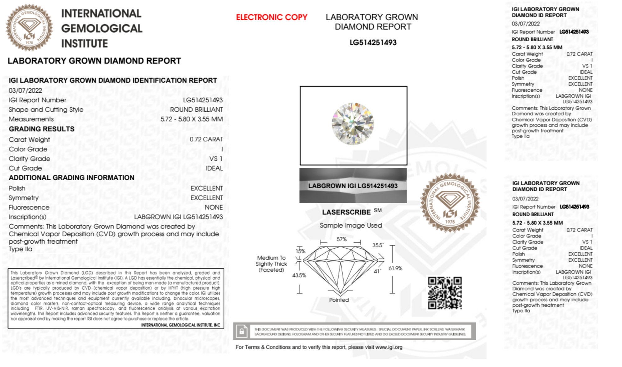 Your 0.72 carat Round lab diamond is graded I color (Near Colorless), and you can read more about I color diamonds here.