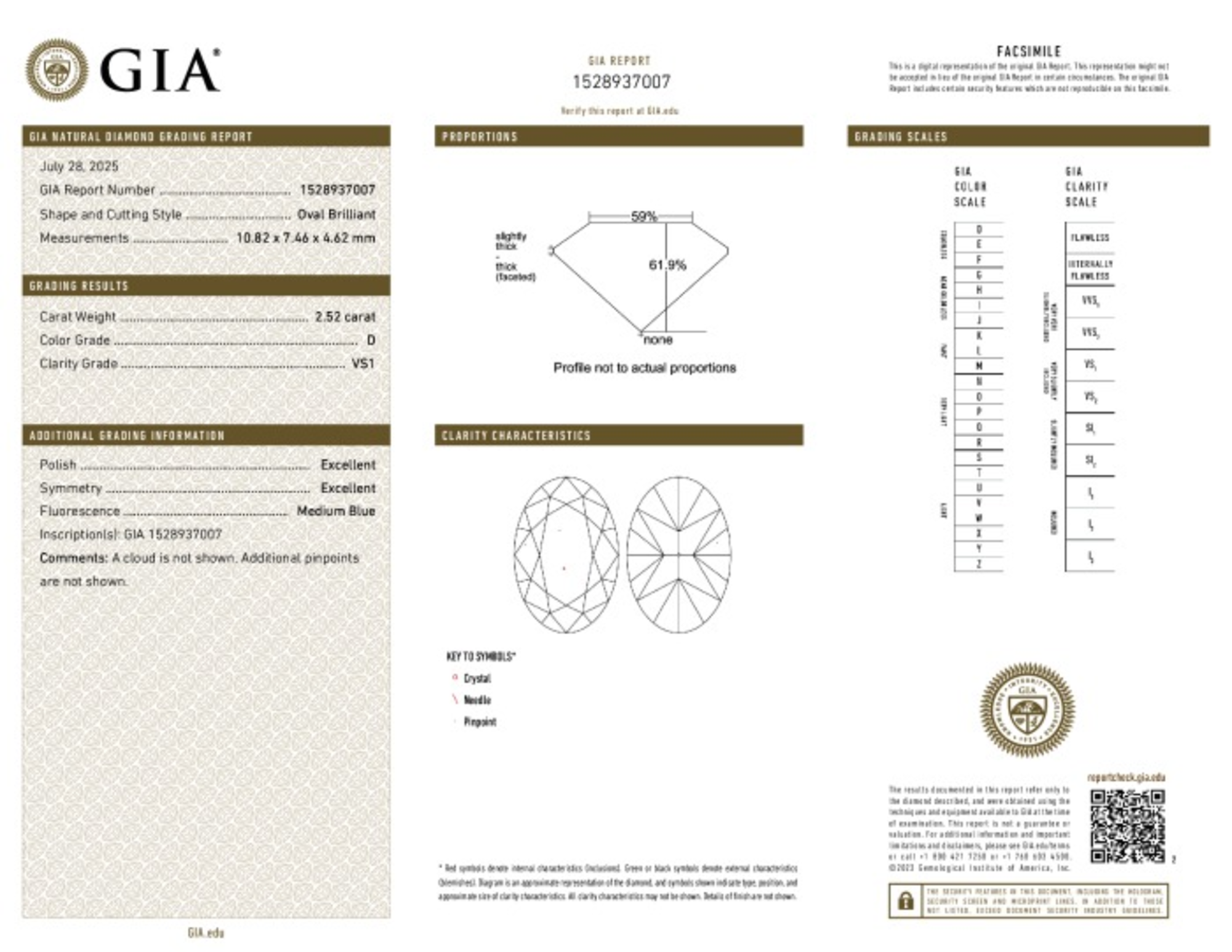 Your 2.52 carat Oval natural diamond is graded D color (Colorless), and you can read more about D color diamonds here.