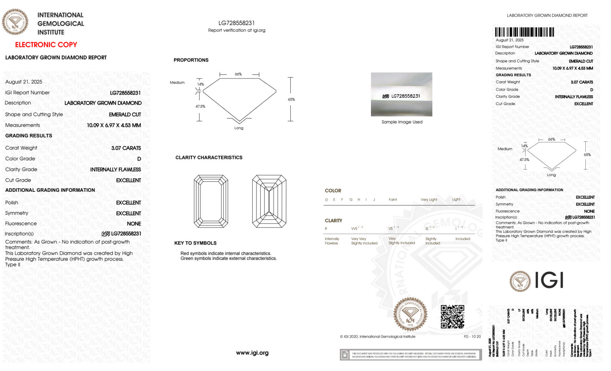 Your 3.07 carat Emerald lab diamond is graded IF clarity, which stands for Internally Flawless. Read more about IF clarity diamonds here, or learn more about diamond clarity in general here.