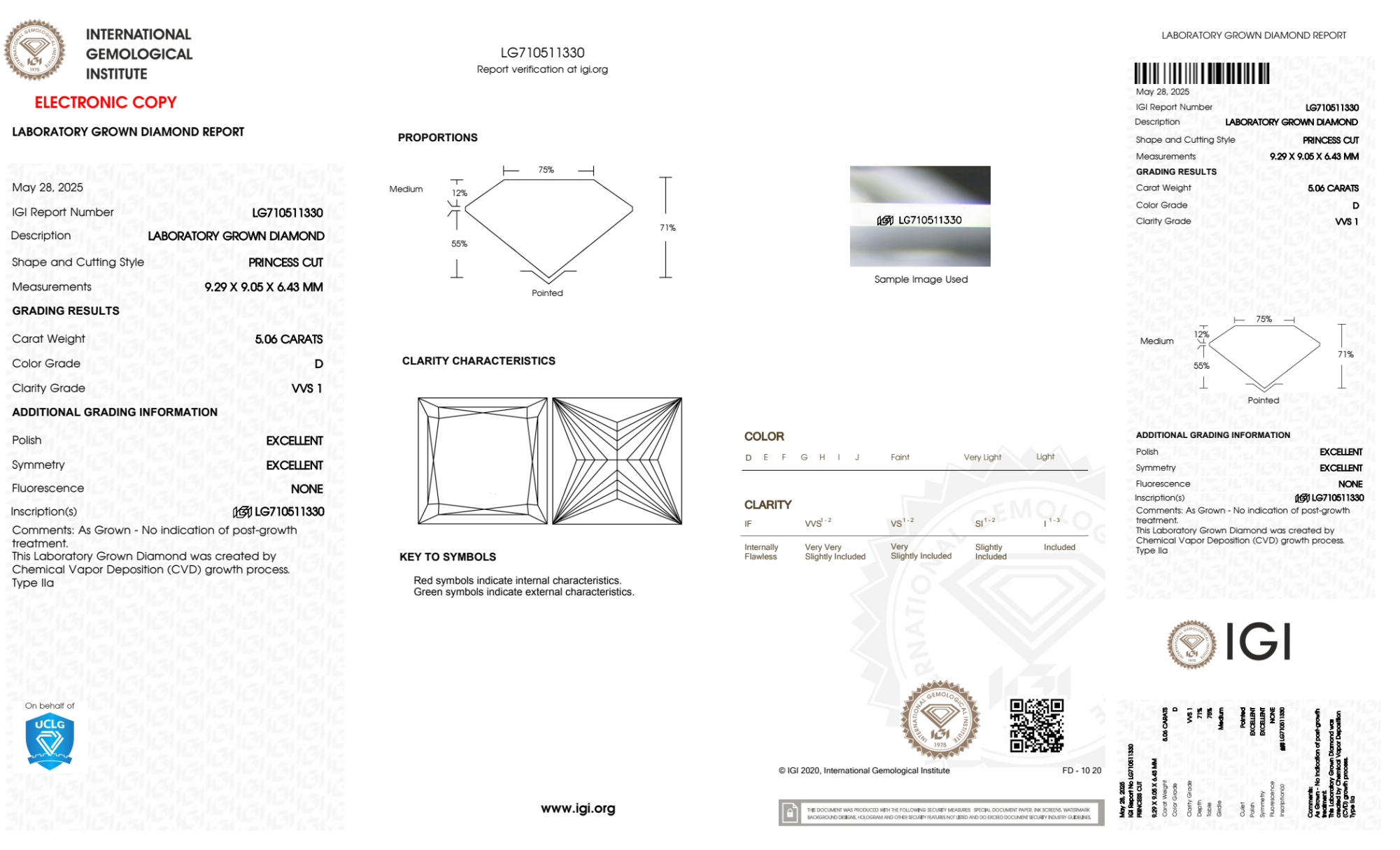 Your 5.06 carat Princess lab diamond is graded D color (Colorless), and you can read more about D color diamonds here.