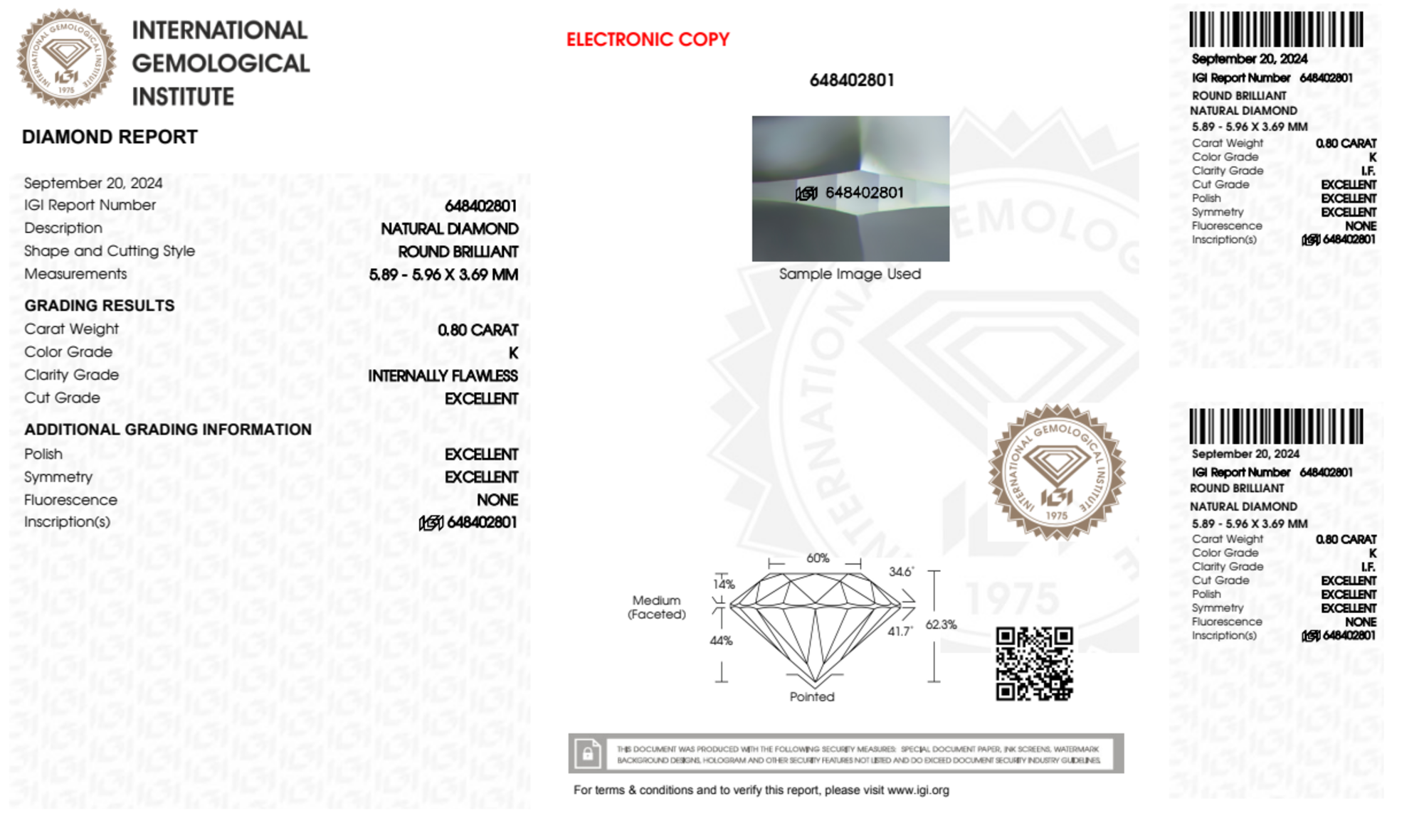 Your 0.80 carat Round natural diamond is graded IF clarity, which stands for Internally Flawless. Read more about IF clarity diamonds here, or learn more about diamond clarity in general here.