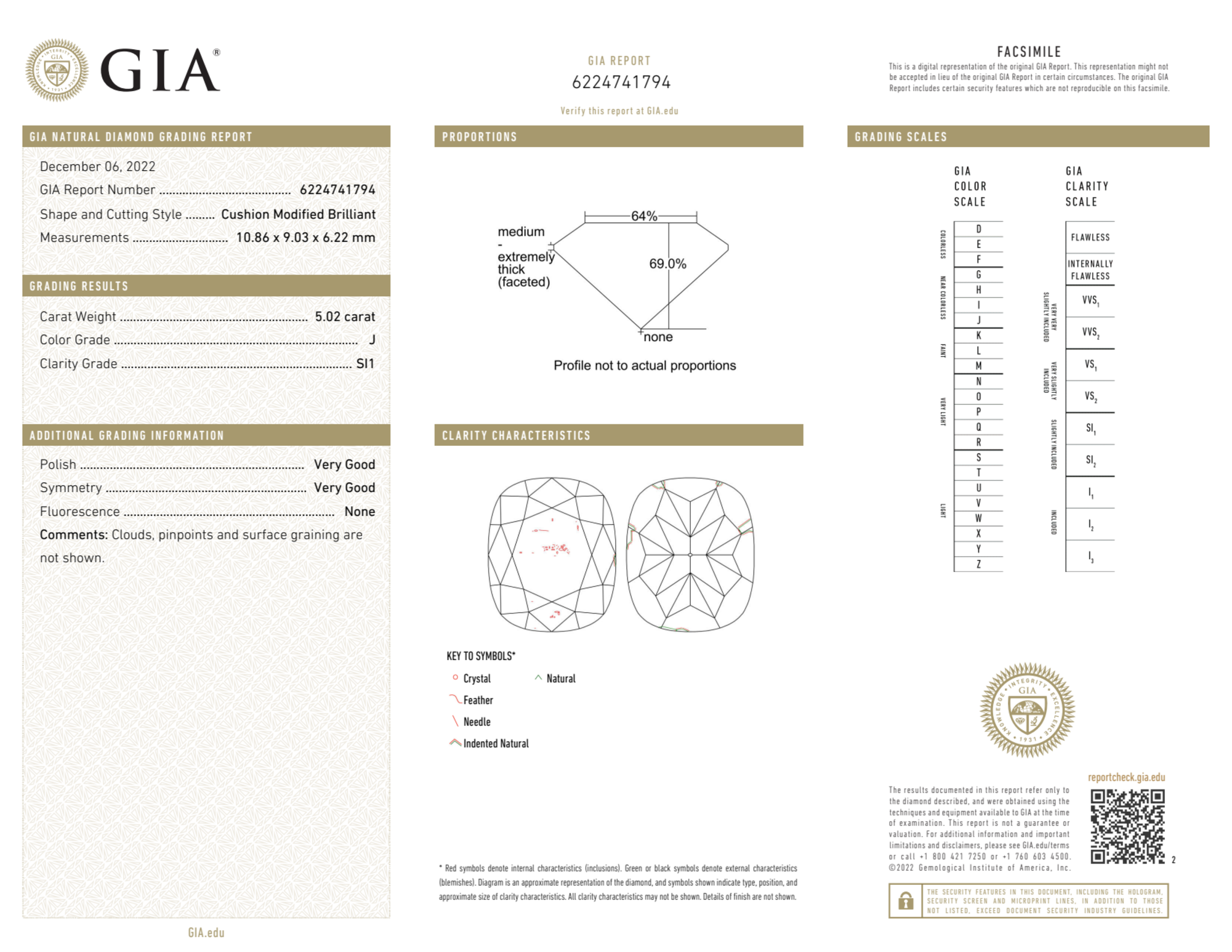 Your 5.02 carat Cushion natural diamond is graded J color (Near Colorless), and you can read more about J color diamonds here.