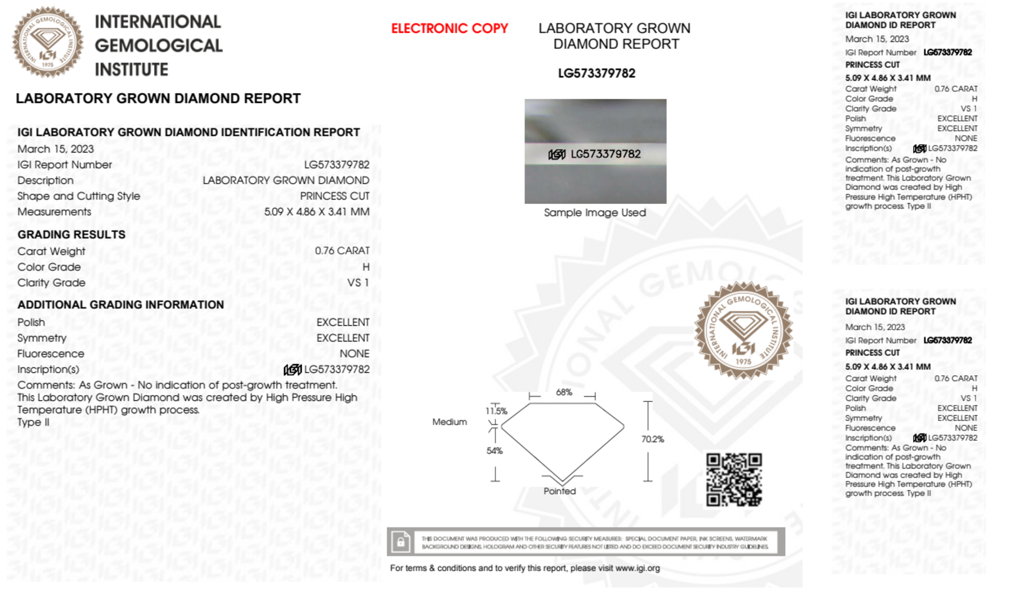 Your 0.76 carat Princess lab diamond is graded H color (Near Colorless), and you can read more about H color diamonds here.