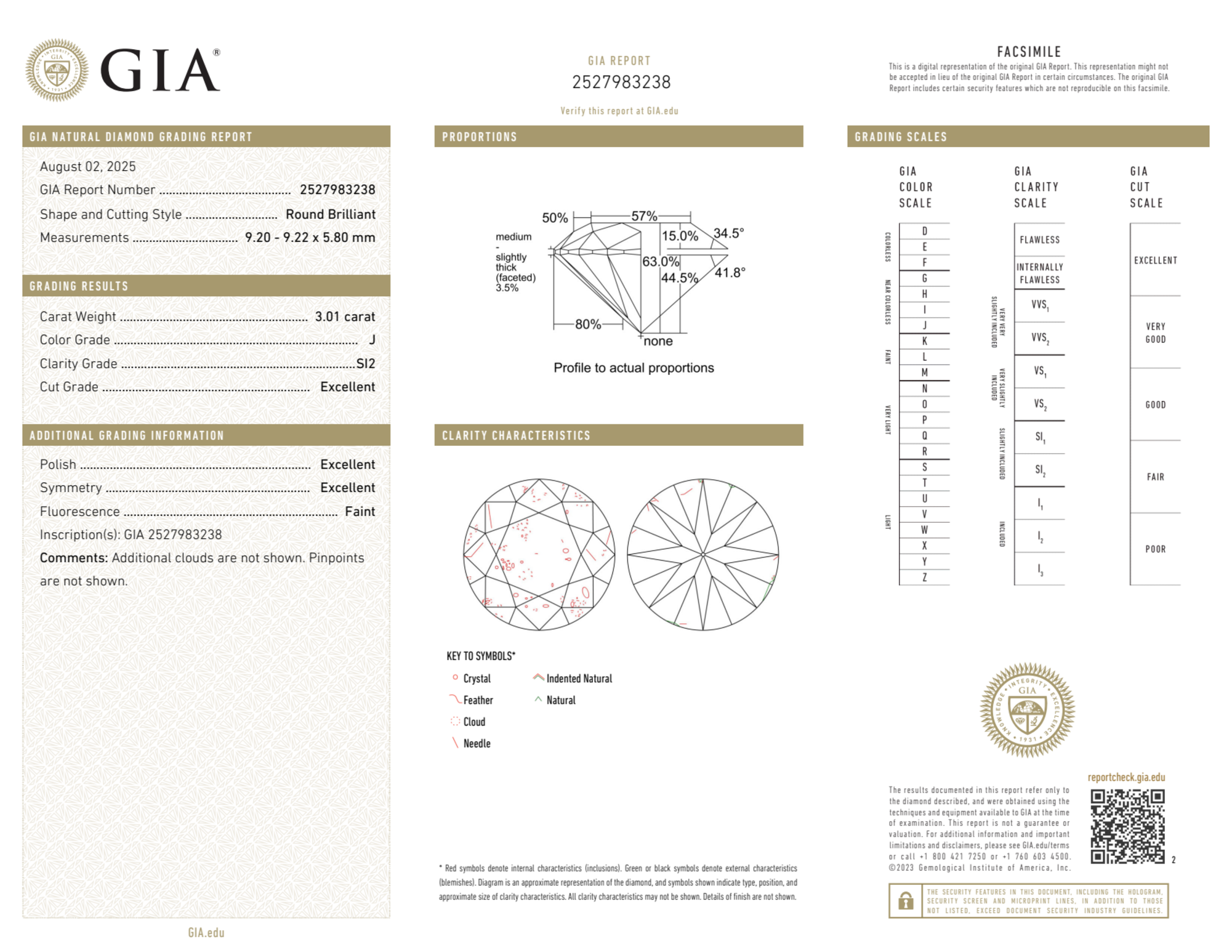 Your 3.01 carat Round natural diamond is graded SI2 clarity, which stands for Slightly Included 2. Read more about SI2 clarity diamonds here, or learn more about diamond clarity in general here.
