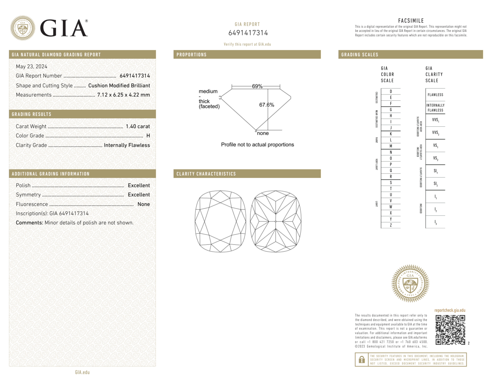 Your 1.40 carat Cushion natural diamond is graded H color (Near Colorless), and you can read more about H color diamonds here.