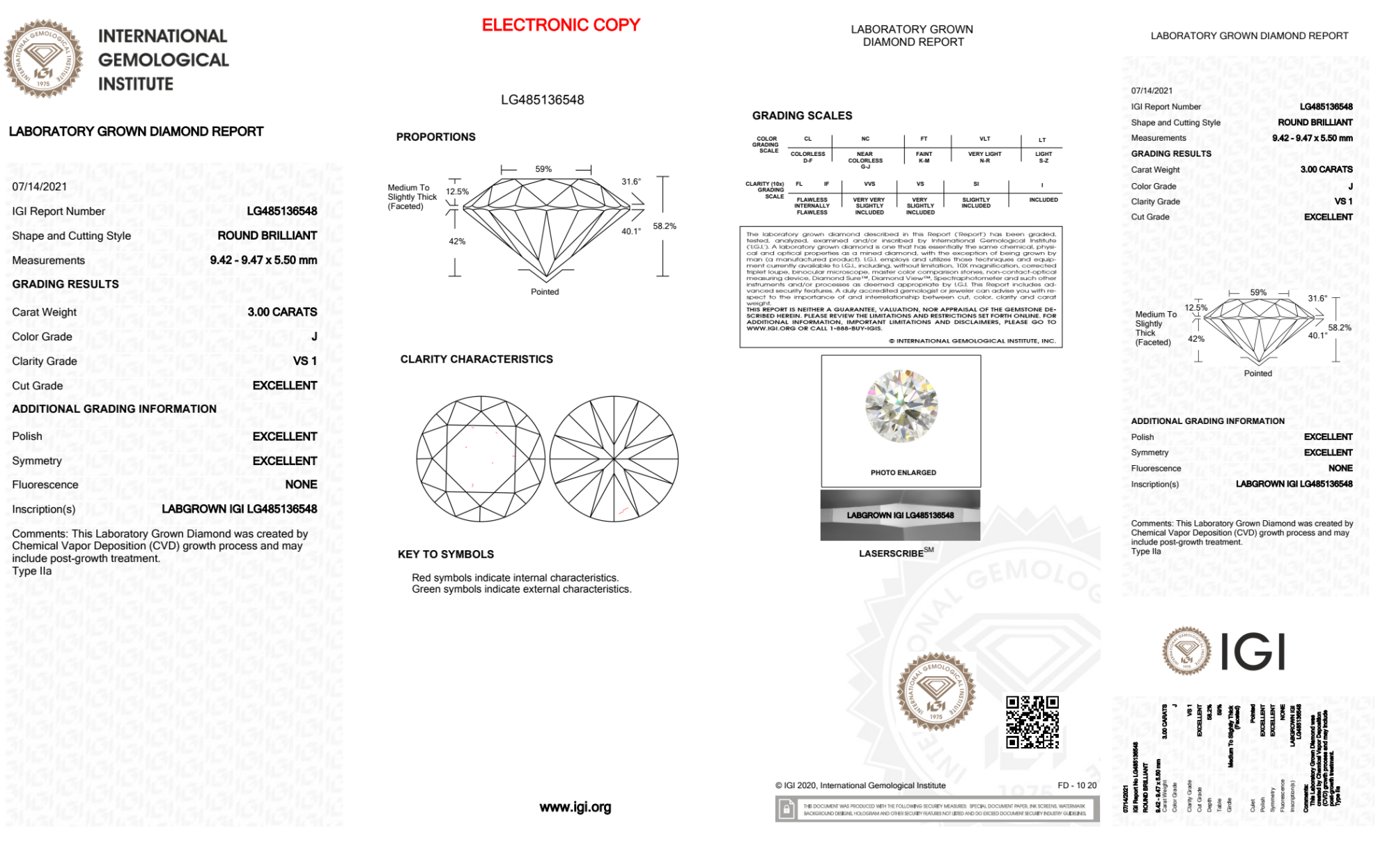 Your 3.00 carat Round lab diamond is graded J color (Near Colorless), and you can read more about J color diamonds here.