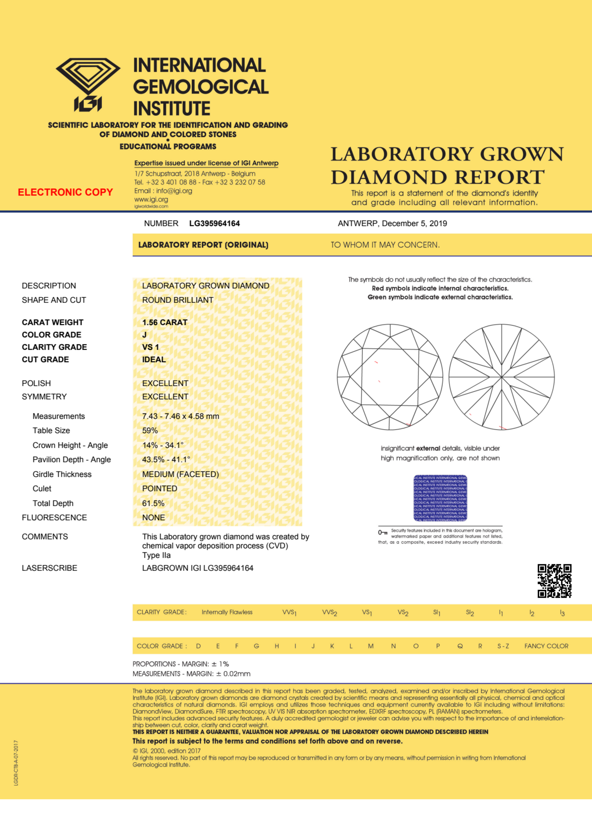 Your 1.56 carat Round lab diamond is graded J color (Near Colorless), and you can read more about J color diamonds here.