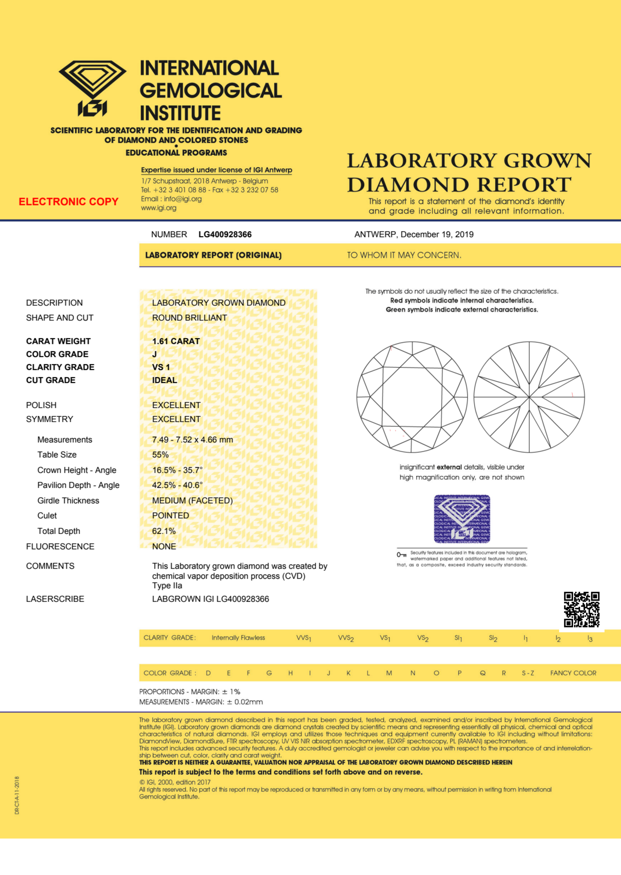 Your 1.61 carat Round lab diamond is graded J color (Near Colorless), and you can read more about J color diamonds here.
