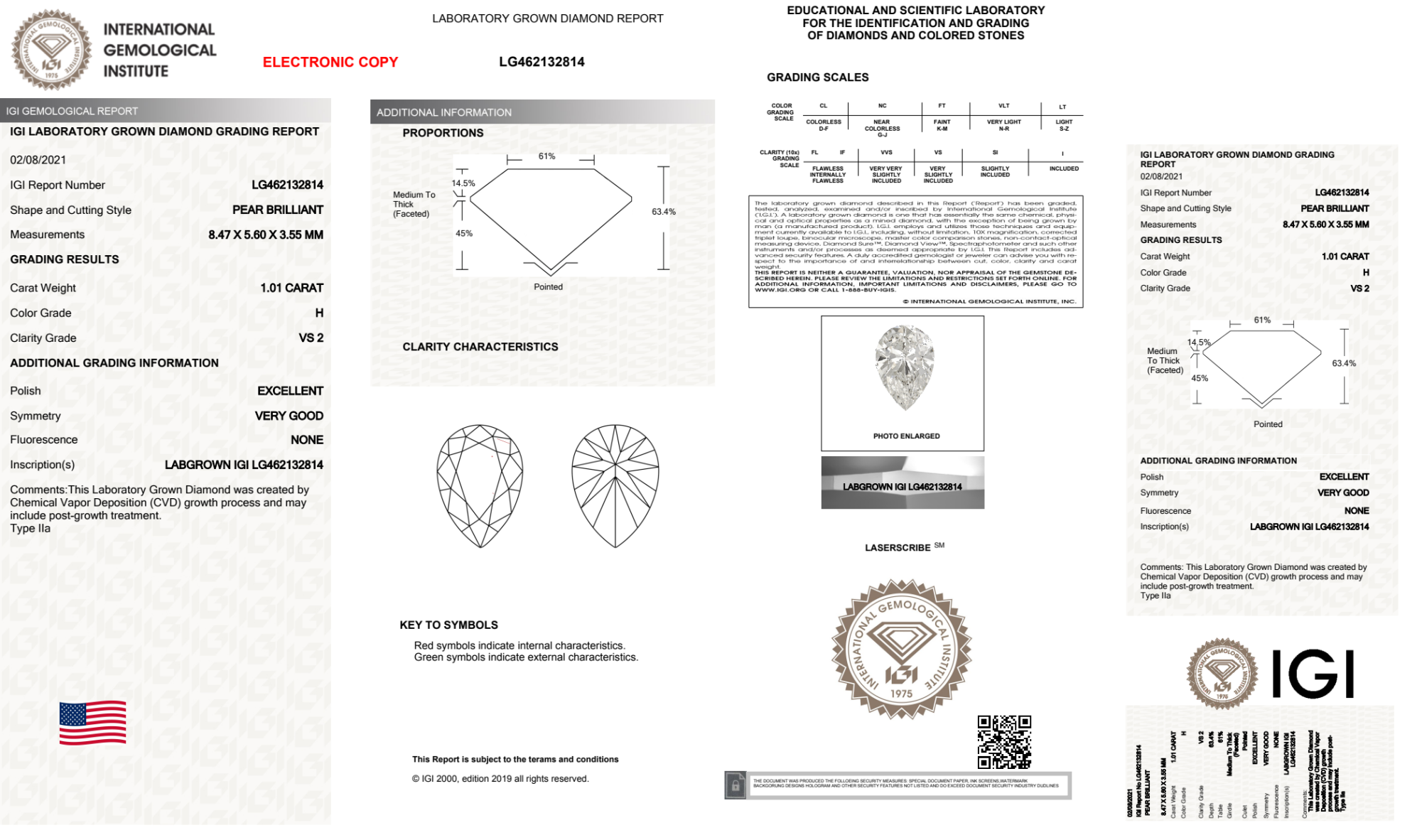 Your 1.01 carat Pear lab diamond is graded H color (Near Colorless), and you can read more about H color diamonds here.